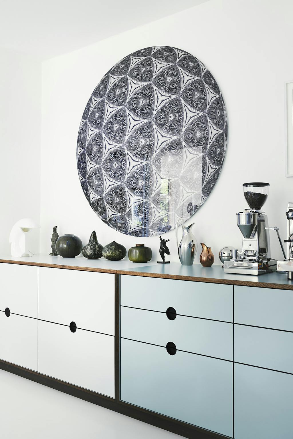 Bij de tuindeur staat een fraai dressoir van Paustian. Erboven hangt een rood werk van de Deense kunstenaar Michael Kvium, die in het lichte universum de liefde van het gezin voor de minimalistische Japanse interieurstijl benadrukt. De ronde salontafel van Warren Platner is gekocht op een veiling.