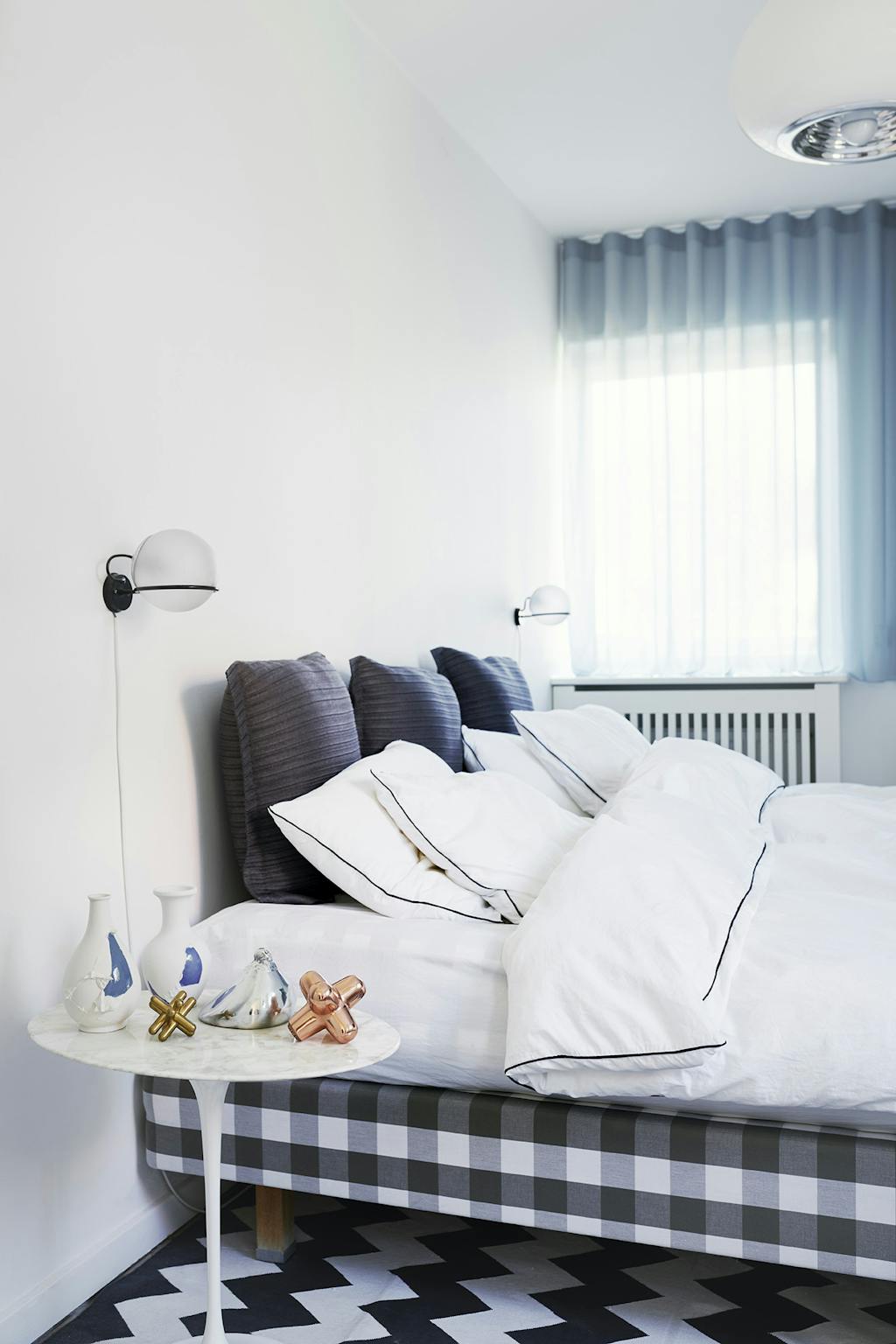 Als extra zitplaats in de woonkamer hebben Dorthe en Kim een stijlvol hoekje ingericht met een zwartleren bank van Arne Jacobsen, die hij ontwierp voor het SAS Royal Hotel. Aan de wand hangen een fotokunstwerk van Marcel Wanders en een foto van de iconische HSBC-bank in Hongkong van architect Norman Foster.