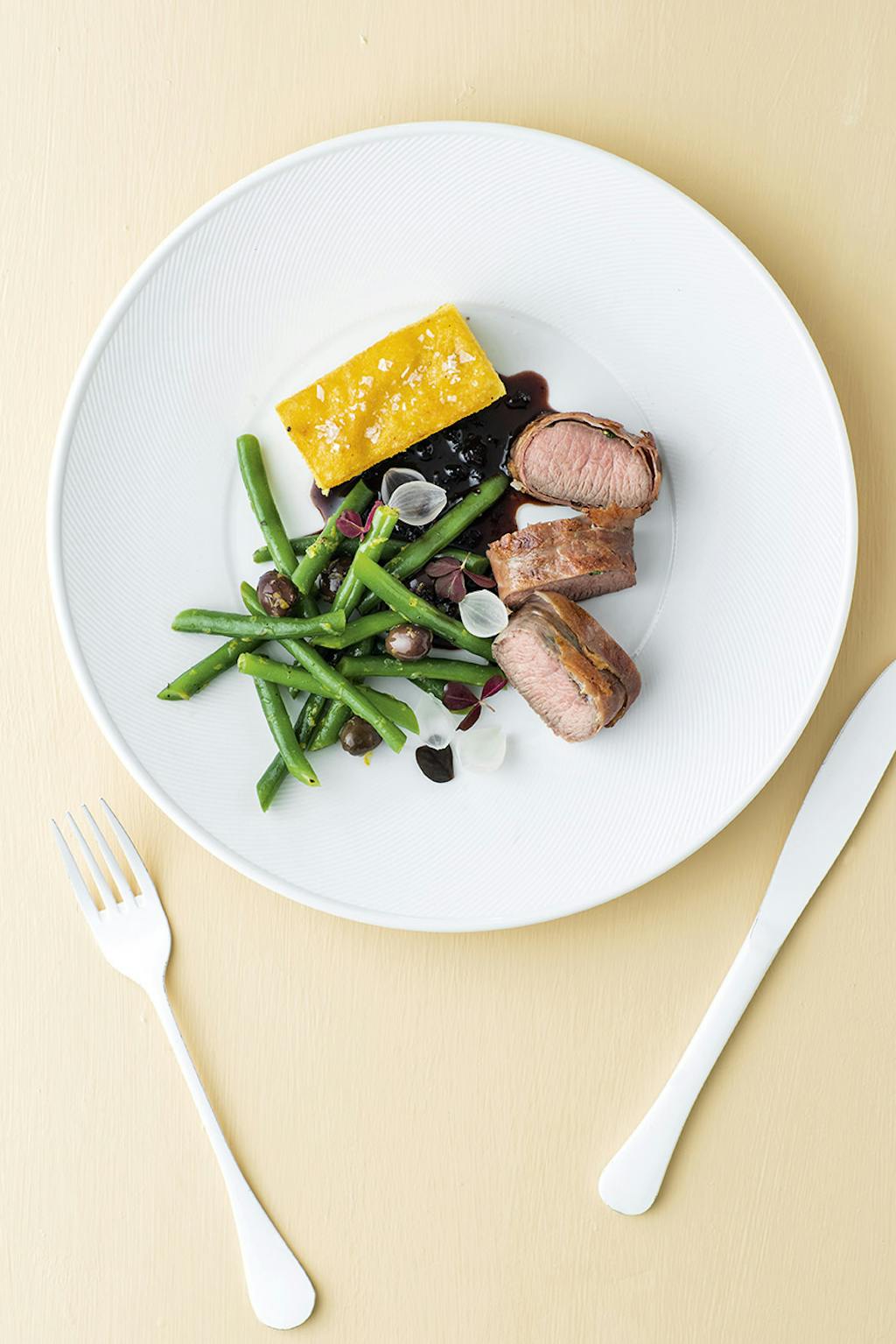 Lam in een jasje van ham met gebakken polenta, sperziebonen en pepersaus