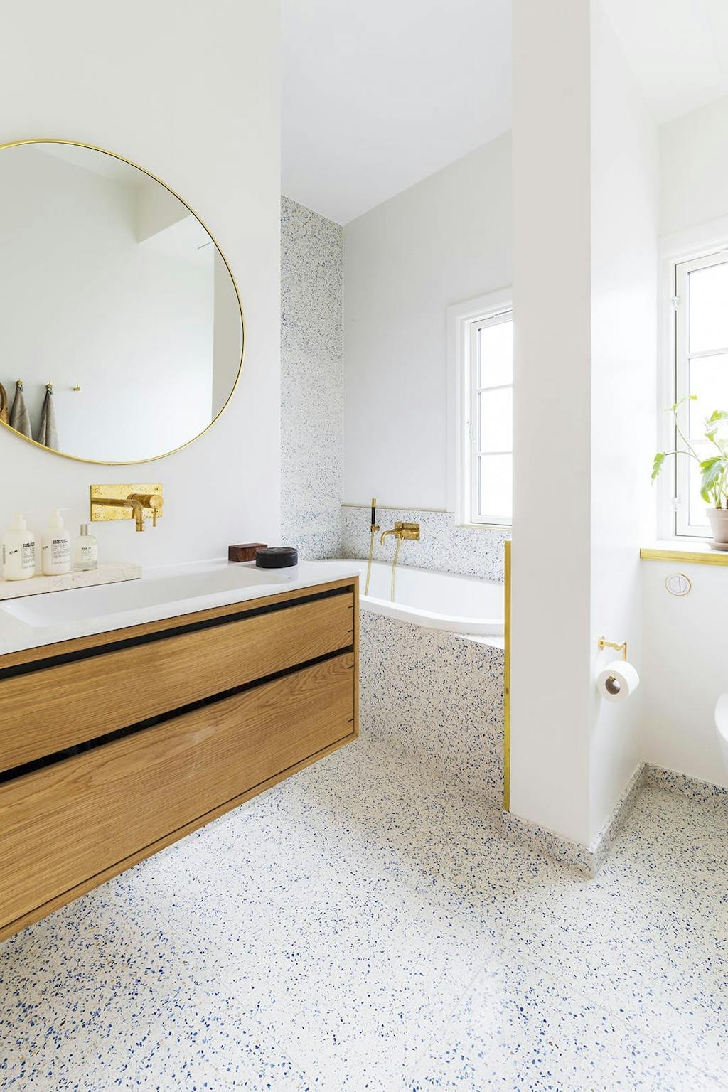 De badkuip is het middelpunt van deze grote badkamer, en dient ook als ontmoetingsplaats voor het gezin van drie personen, die allemaal tegelijk in de badkuip kunnen.