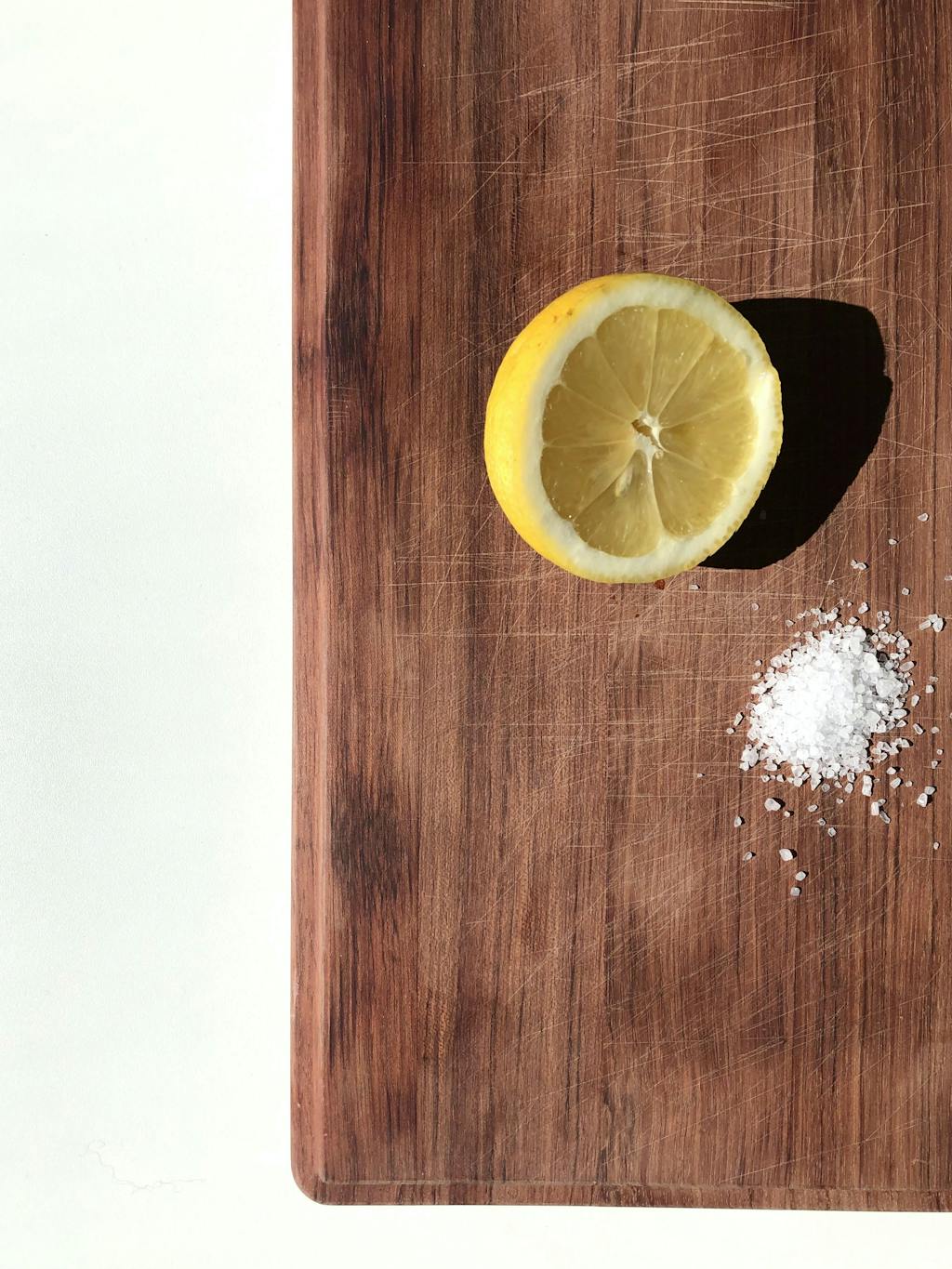 Snijd een citroen in schijfjes en strooi een lepel grof zout over de snijplank. Wrijf de citroen met ronddraaiende bewegingen over de snijplank en het zout.