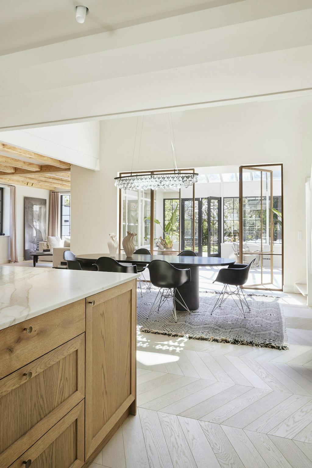 In het verlengde van de keuken staat een grote eettafel, waarmee de wens van een ruime woonkeuken is ingelost. Je kunt er met veel mensen aan zitten, en omdat je hier helemaal tot aan de nok kunt kijken, is het ruimtegevoel fantastisch.