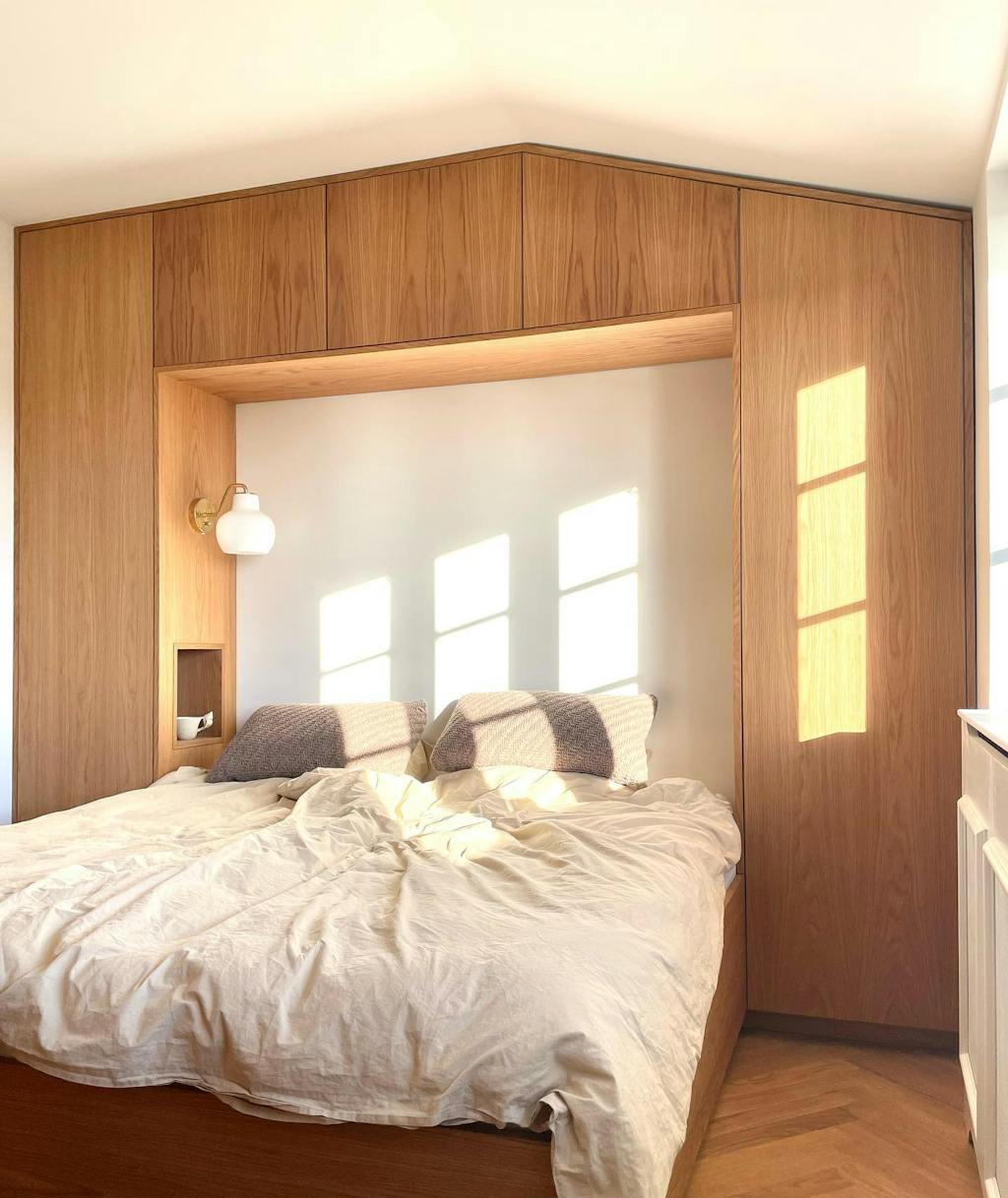 Daarna heb ik gespeeld met de uitdrukking op het eikenhouten bedframe, dat eruit moet zien alsof het rechtstreeks uit het kastframe is gesneden en op de vloer is geplaatst. Zodat deze dezelfde hoogte heeft als de diepte van de kast.