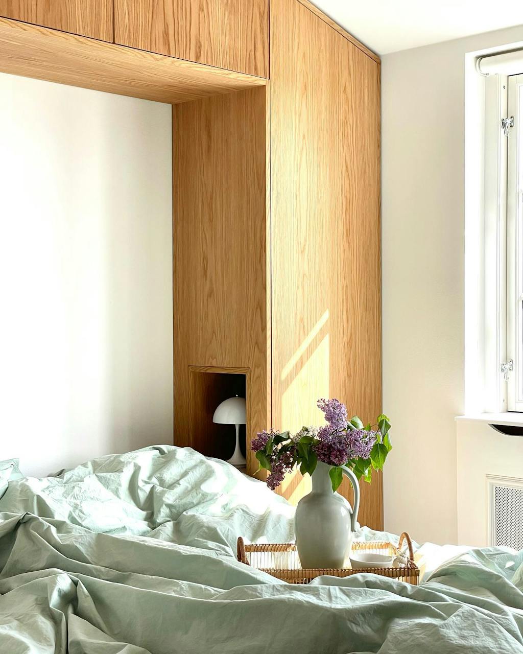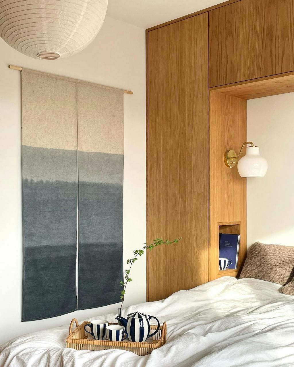 - Zelf ga ik voor natuurlijke en rustige kleuren in de slaapkamer, en kleuren die niet stressen. In onze slaapkamer, die niet zo groot is, hebben we er ook een prioriteit van gemaakt om kleding en schoenen volledig weg te werken achter kastfronten, gewoon zodat deze niet te veel lawaai maken. Daarnaast heb ik de slaapkamer met weinig voorwerpen ingericht; prachtige lampen, die voor de juiste verlichting zorgen, en daarnaast wat rustige textielkunst aan de muur en een spiegel.