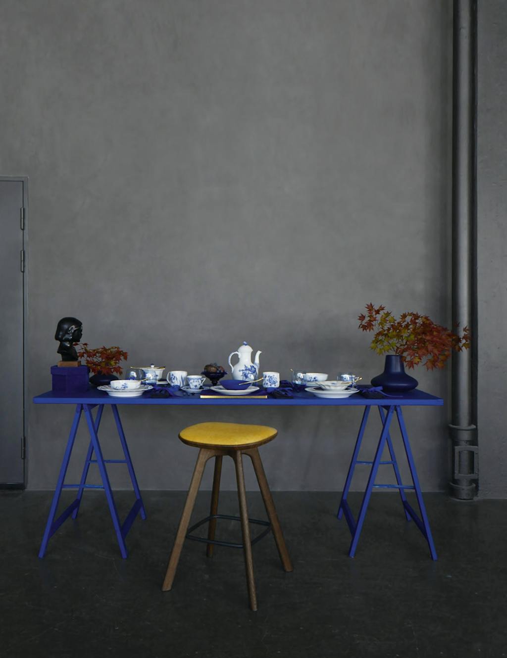 Het eetbare bord, BioTrem, gegoten van tarwezemelen, is verkrijgbaar in een diepe en een platte variant. Als je het buiten na een picknick laat liggen, is het binnen 30 dagen afgebroken. H. Skjalm P. Vork, zwart, ontwerp van Nicolas Vahé, H.Skjalm P. Keramieken vaas met deksel en gat voor een lepel, Muubs. Houten bord, Terkel Skou Steffensen. Onberbord, Kystens Træfældning. Lepel, Caravel, zwart, Georg Jensen. Vork, uit hout gesneden, Muubs. Glas, Madam Stoltz. Keramieken borden, kerriegeel, Metha Stuart Wallace. Bestek, ontwerp van Nicolas Vahé, H. Skjalm P. Houten lepel, Muubs. Kommen, kleur Midnight, Tina Marie Copenhagen Handmade. Vazen, unieke exemplaren, kleur Dodenkopf, Tina Marie Copenhagen Handmade. Hoornbestek, Hornvarefabrikken. Dekservetten, linnen, Linum. Koffiekan, zwart, Kinto/JJCompany. Cafetiere , roestvrij staal, glas en walnoot, Kinto/JJCompany. Stoel, F-Chair, in zwartgebeitst beuken, ontwerp van Rasmus Fex, Brdr. Krüger. De wanden zijn geverfd in de kleuren Lava en Mauve, Kabe Copenhagen. Petroleumlamp, privé-eigendom.