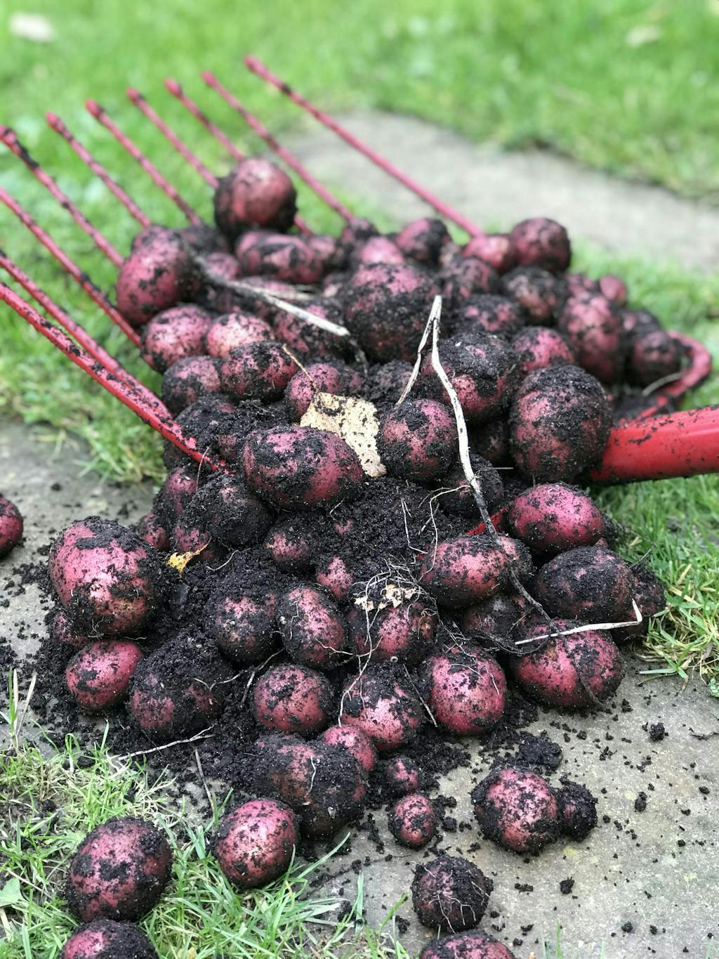 Maak een geul of gat in de grond (of een verhoogd bed) en zet de aardappelen met de kiemen naar boven, ongeveer 25 cm uit elkaar en op een diepte van 6-8 cm. Vergeet niet om de aardappelen één keer per week te rooien zodat ze niet groen worden en meer aardappelen produceren.