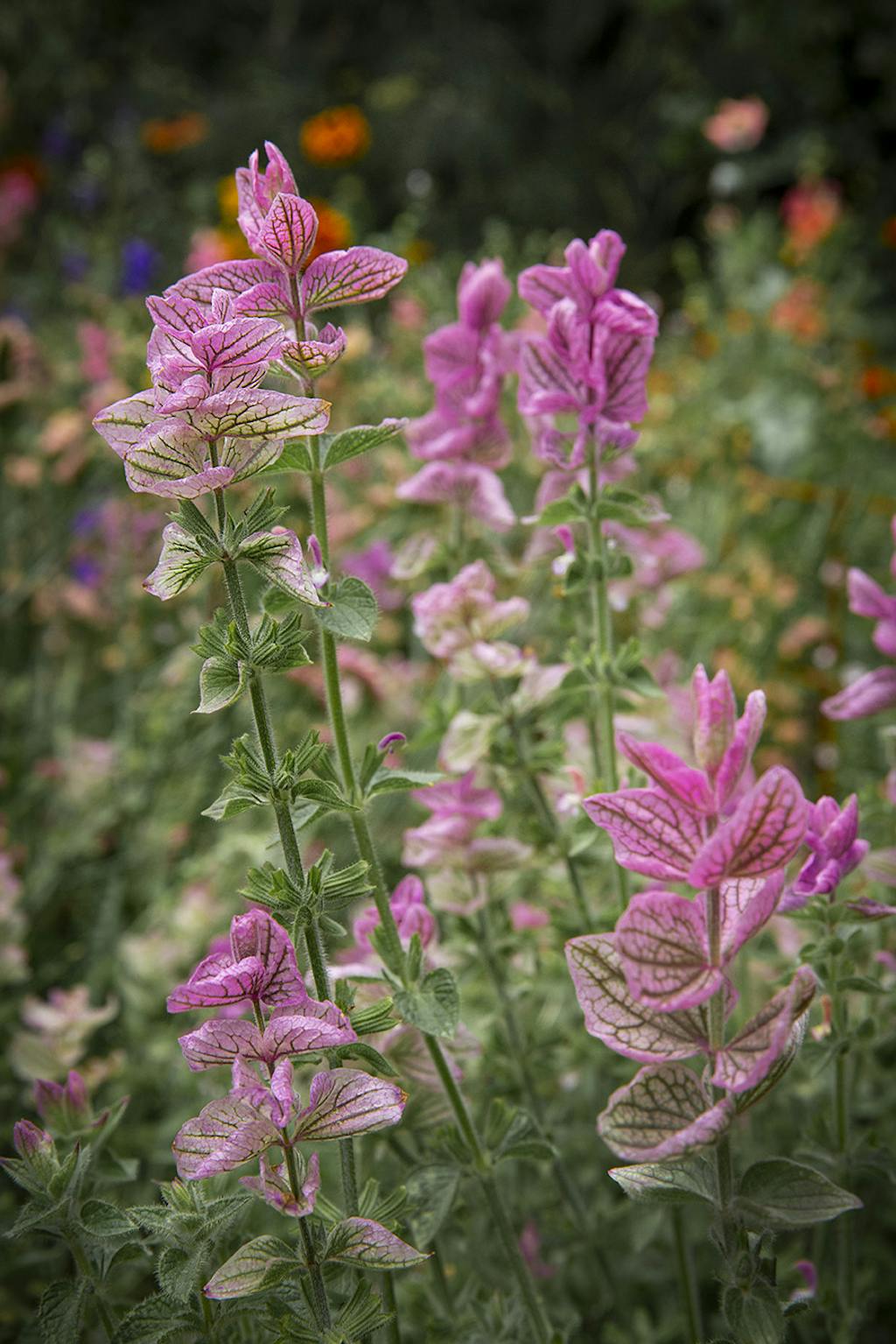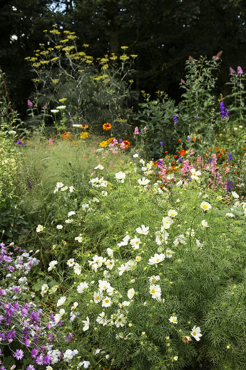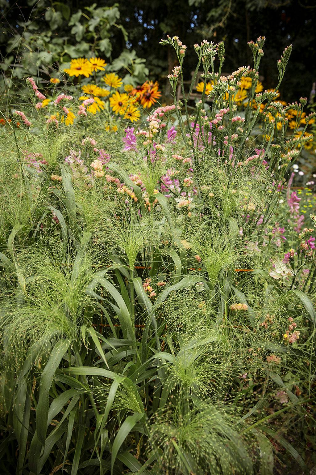 De pluktuin, die tegen de moestuin aan ligt, is een symfonie van grassen en zomerbloemen. Het eenjarige fonteingras is een favoriet en doet het goed in boeketten. De crèmekleurige Cosmos heet ‘Xanthos’, en erachter staat ruige zonnehoed. Helemaal achteraan zie je de hoge rode venkel, die lekker smaakt en ook geschikt is voor boeketten.