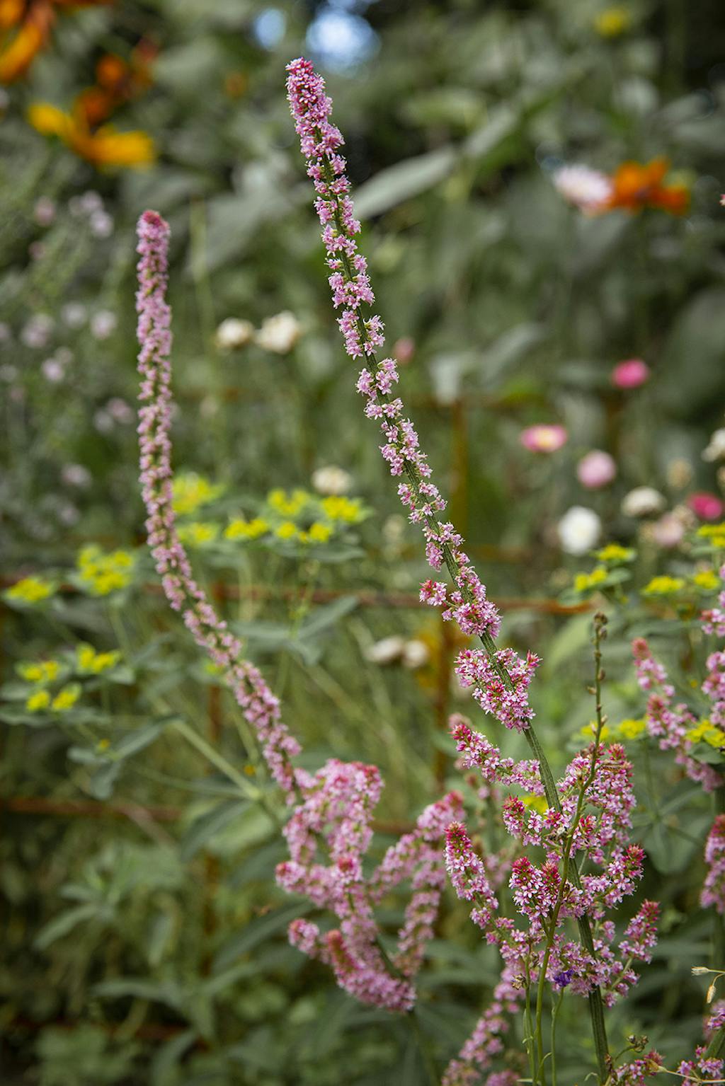 De lange roze pluimen van de Limonium suworowii verlenen de tuin een magische lichtheid.