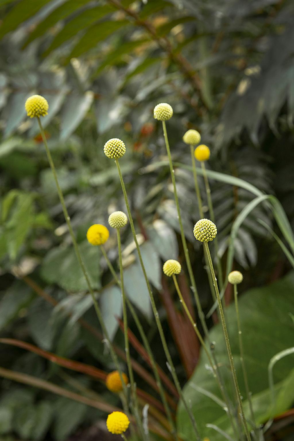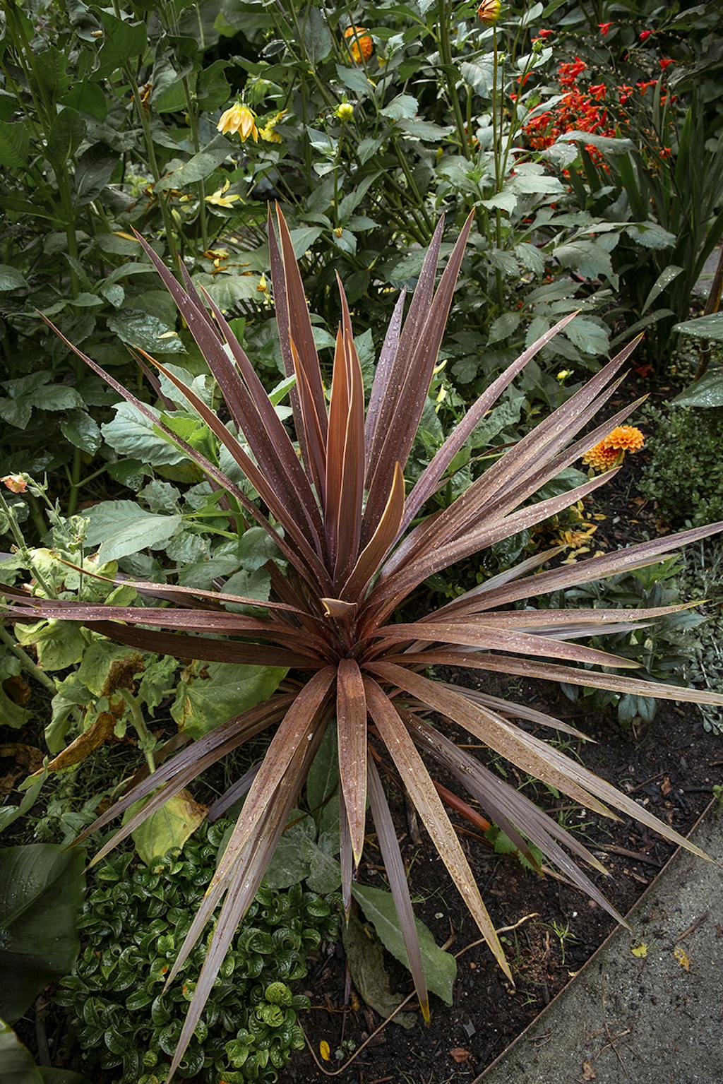 De cordyline valt op met zijn bruinrode kleur. Hij komt inheems voor ten westen van de Stille Oceaan en benadrukt de exotische sfeer.