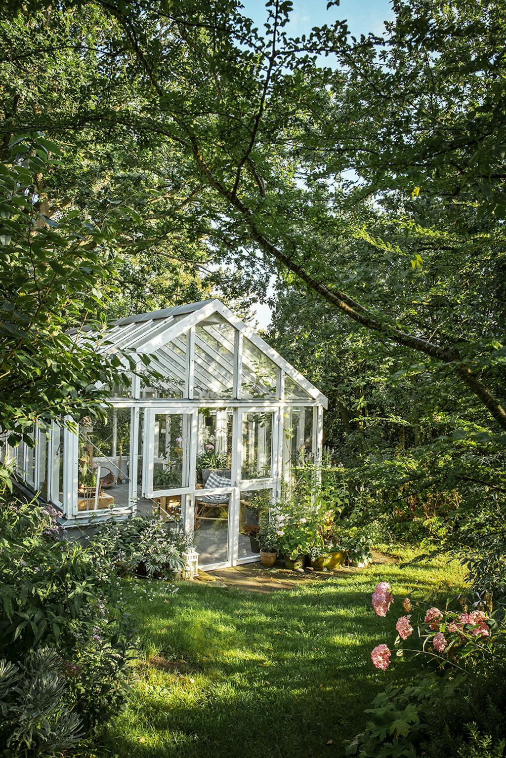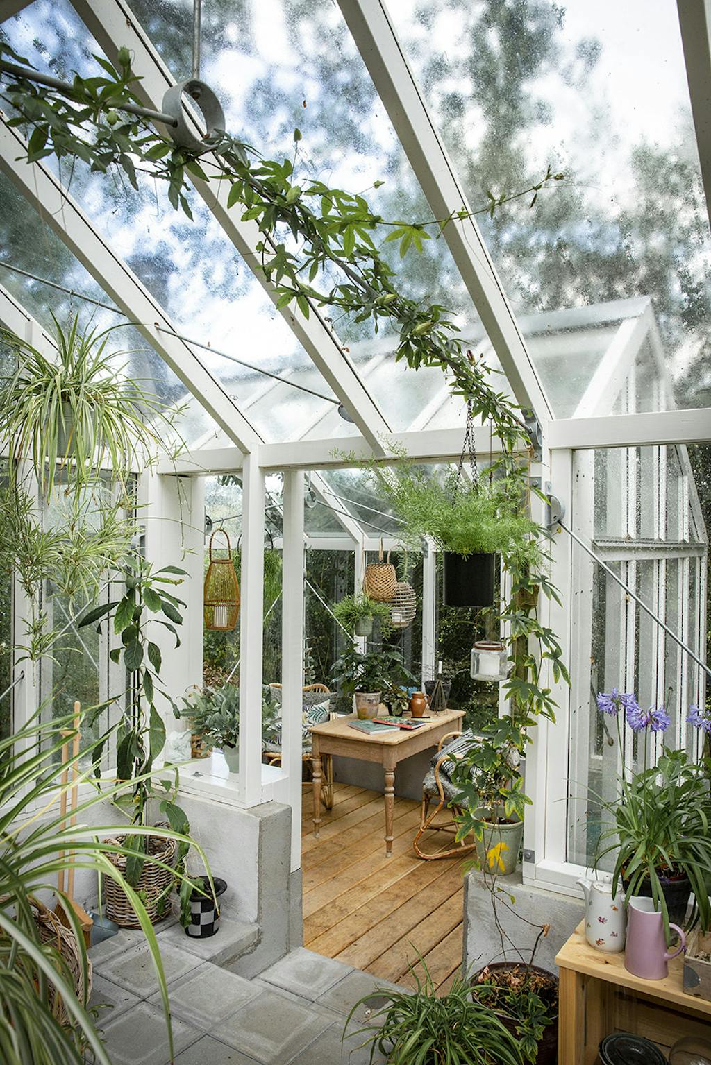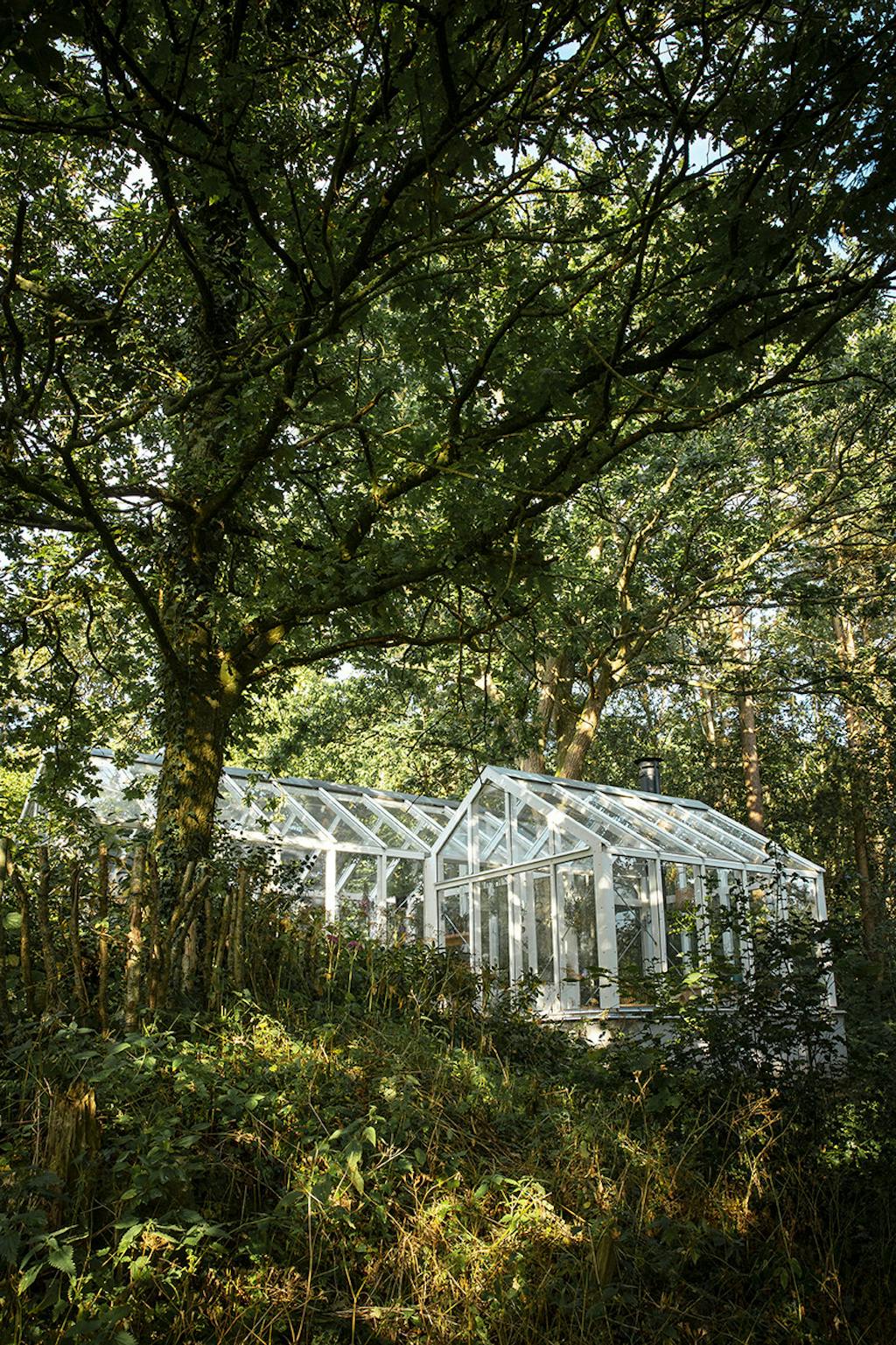 DoorDe oranjerie staat op een fijne plek op de heuvel, tussen bomen, wolken van Chinese ruit en groepen potplanten in op elkaar afgestemde kleuren. De oranjerie is door Lottes man Søren ontworpen en gebouwd. Hij meet ongeveer 30 m2 en heeft een houtkachel.