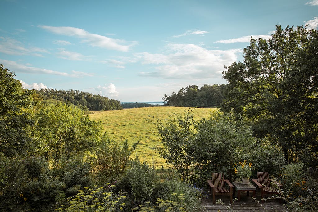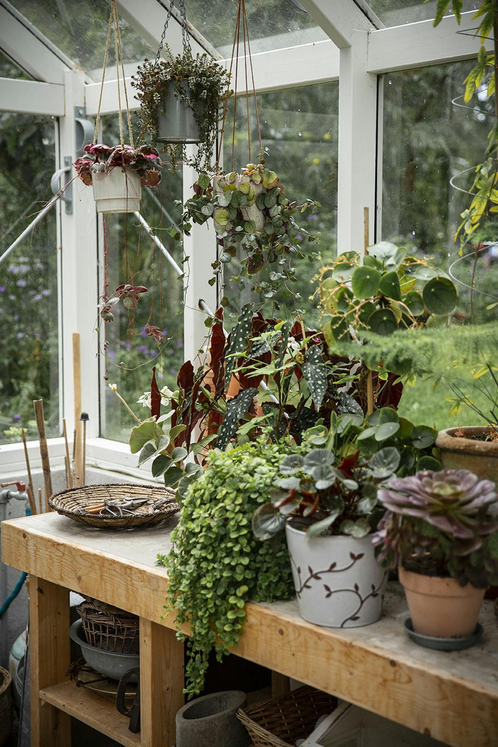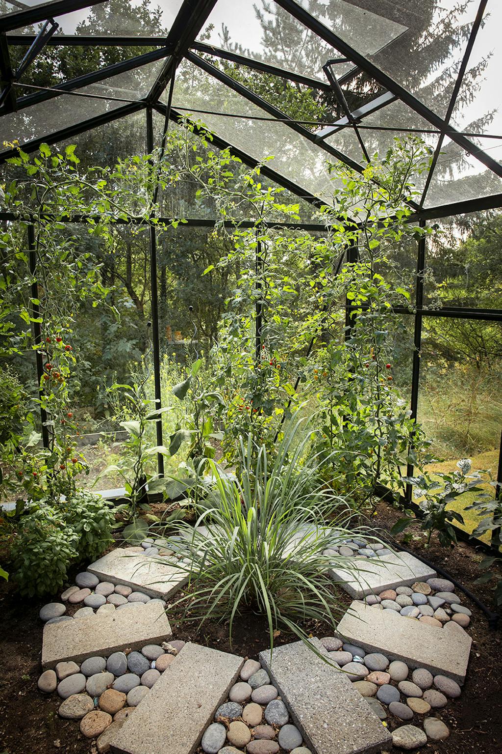 DoorDe oranjerie staat op een fijne plek op de heuvel, tussen bomen, wolken van Chinese ruit en groepen potplanten in op elkaar afgestemde kleuren. De oranjerie is door Lottes man Søren ontworpen en gebouwd. Hij meet ongeveer 30 m2 en heeft een houtkachel.