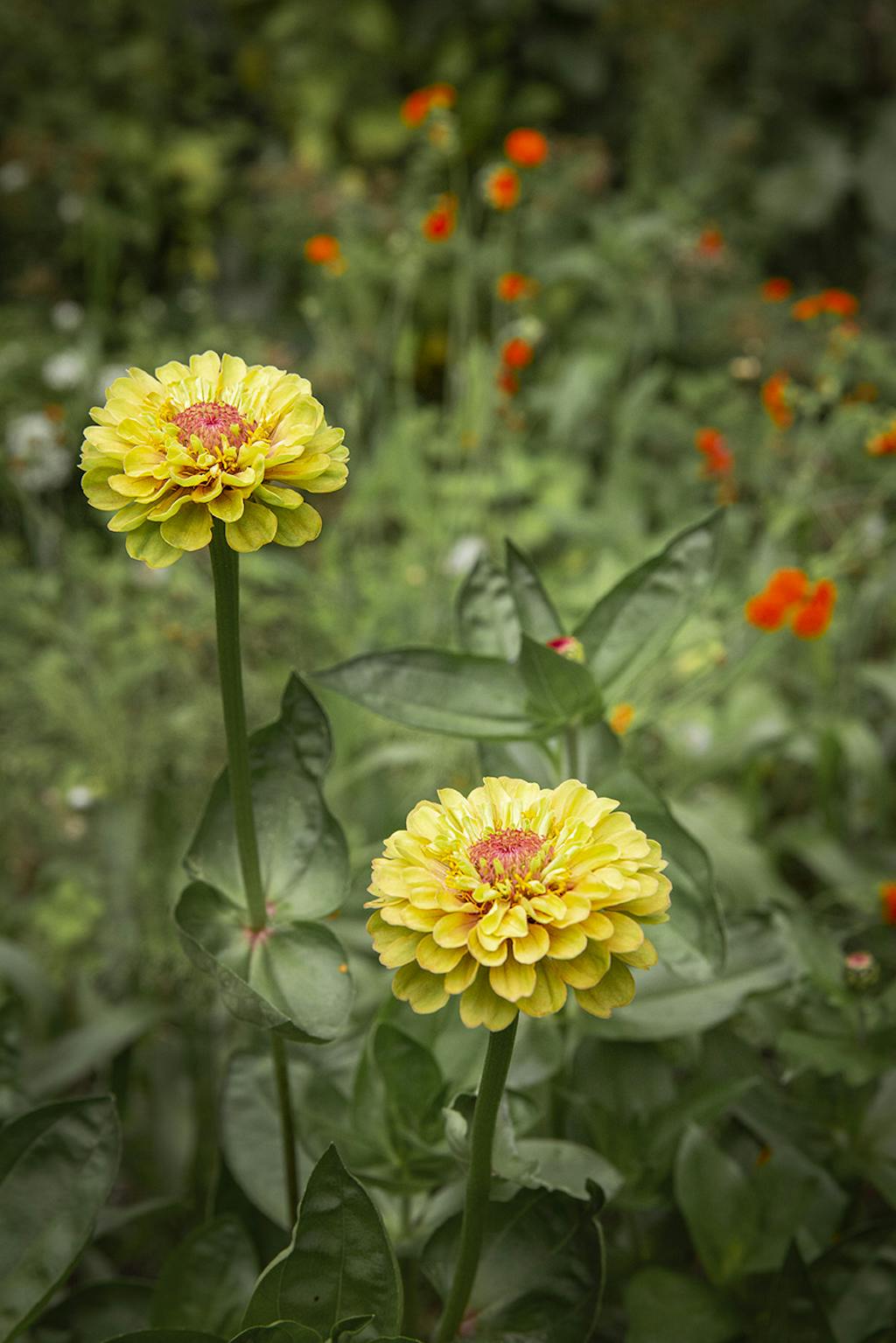 De zinnia elegans ‘Queen Lime Red’ kleurt met zijn rode hart mooi bij de rode Emilia ‘Scarlet Magic’ op de achtergrond.
