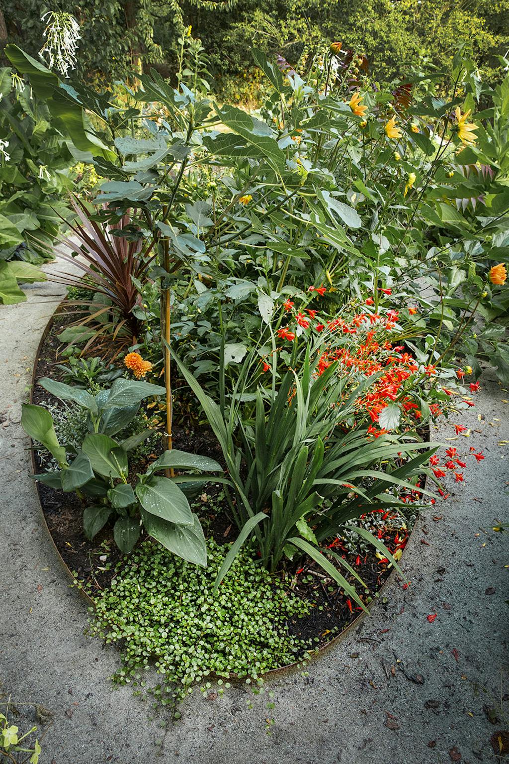 Het ovale plantenbed wordt aan één kant afgeperkt door cortenstaal. In het bed groeien de bodembedekker Muehlenbeckia complexa, vijg, Cordyline, Japanse esdoorn, montbretia, dahlia’s in warme kleuren en vingerplanten. De paden zijn van steenmeel.