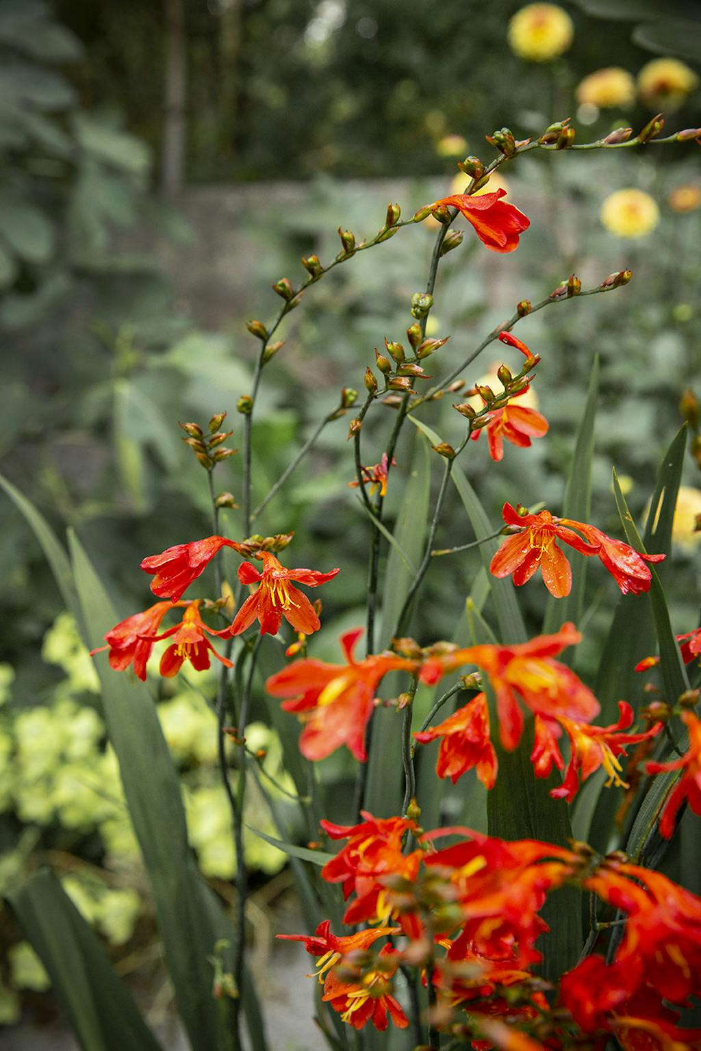 De fraaie montbretia voelt zich helemaal thuis in het exotische hoekje, want hij wordt graag verwend met warmte en beschutting. Hij vangt de aandacht met zijn rode, fresia-achtige bloemen, lange spitse bladeren en ruim 120 centimeter hoogte.