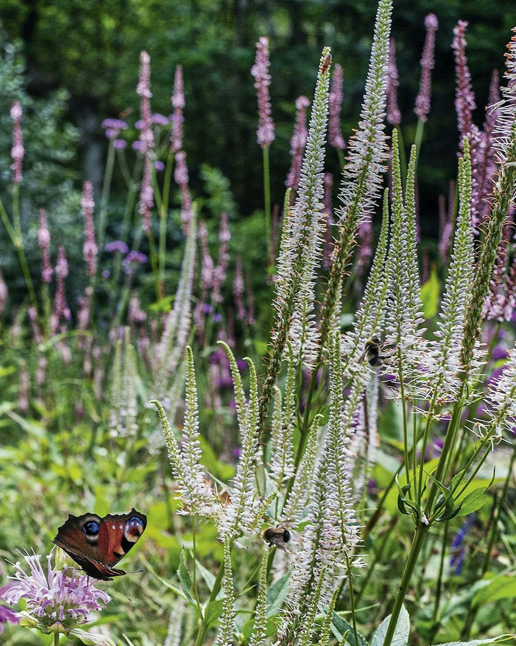 © Birgitta Wolfgang Bjørnvad - Een vlinder vindt nectar in de bloem van een monarda. Het is een van de planten die tijdens de bloeiperiode de meeste insecten aantrekt. Bovendien geven Virginische ereprijs en duizendknoop het bed enkele mooie verticale lijnen.