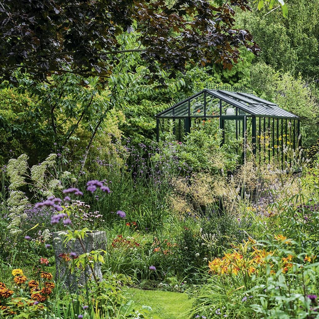© Birgitta Wolfgang Bjørnvad - Een verzameling geurende geraniums siert de hoogte van de decoratieve serre, die discreet in de bloemenzee van de tuin glijdt.