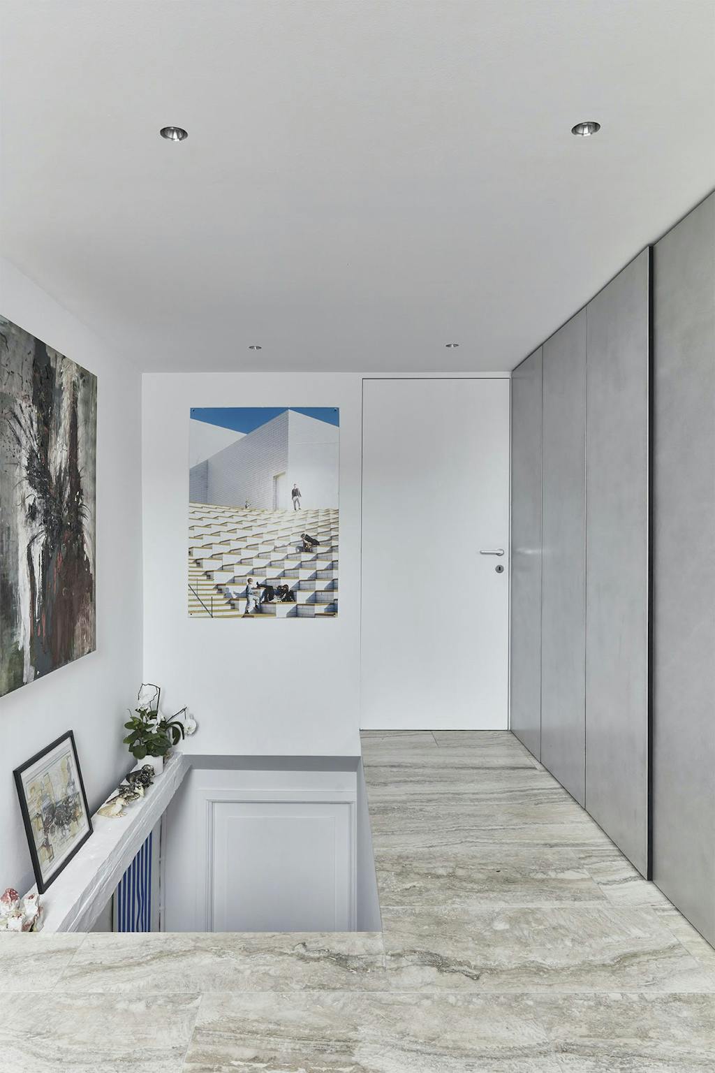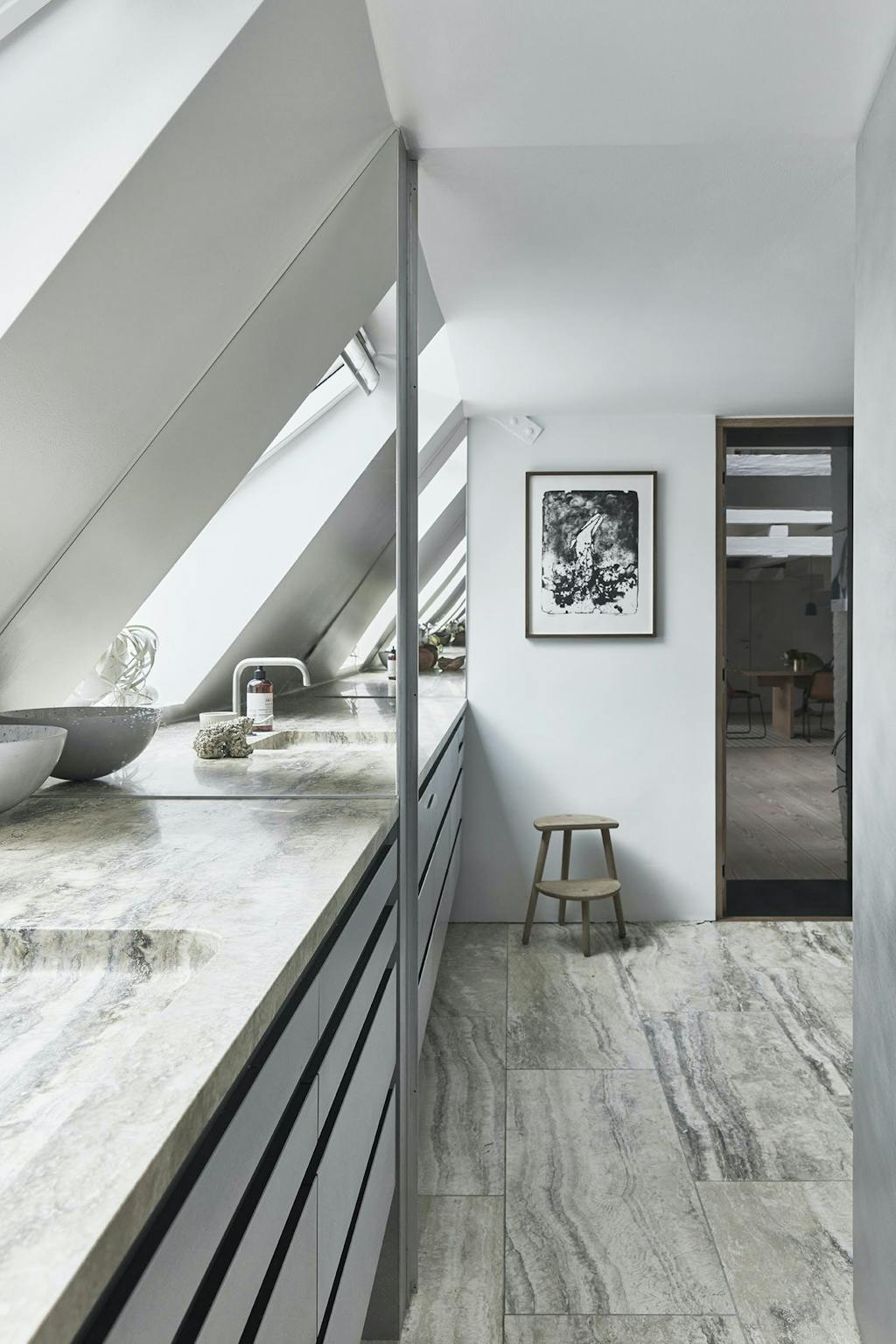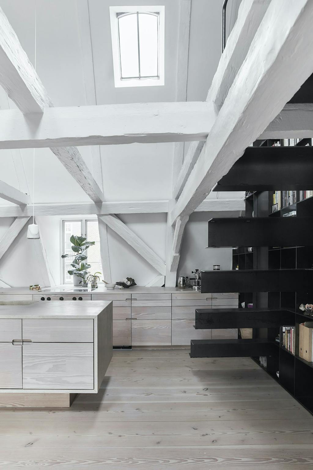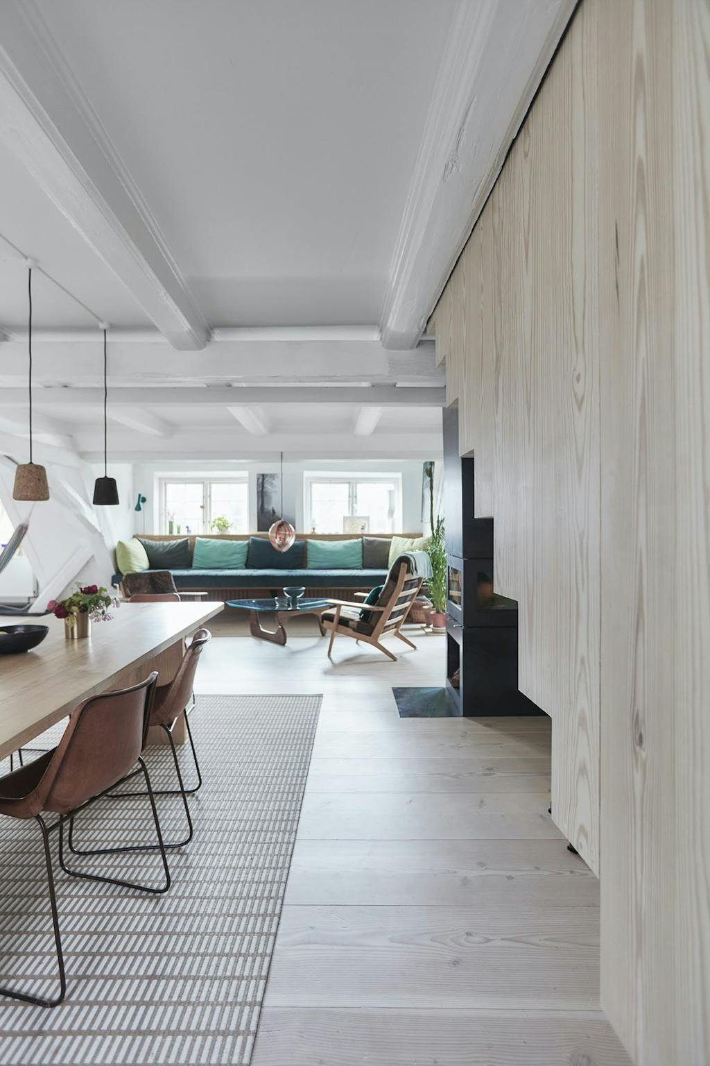 DoorOorspronkelijk lag er een oude grenen vloer in de grote woonkeuken. David wilde die opschuren, maar de vloer liep zo scheef dat hij hem uiteindelijk heeft vervangen door Dinesen planken. Het grenen is hergebruikt in de woonkamer boven en voor de sculpturale trap. De wereldbol kreeg David van zijn Italiaanse moeder. Het was een van de weinige erfstukken die ze bij zich had toen ze naar Denemarken emigreerde.
