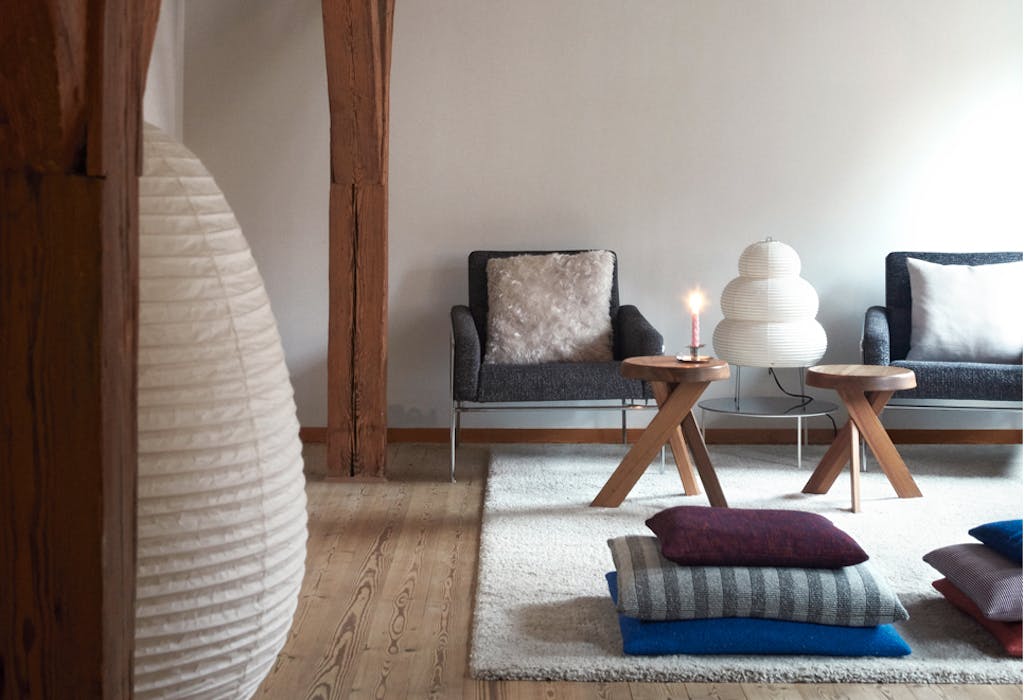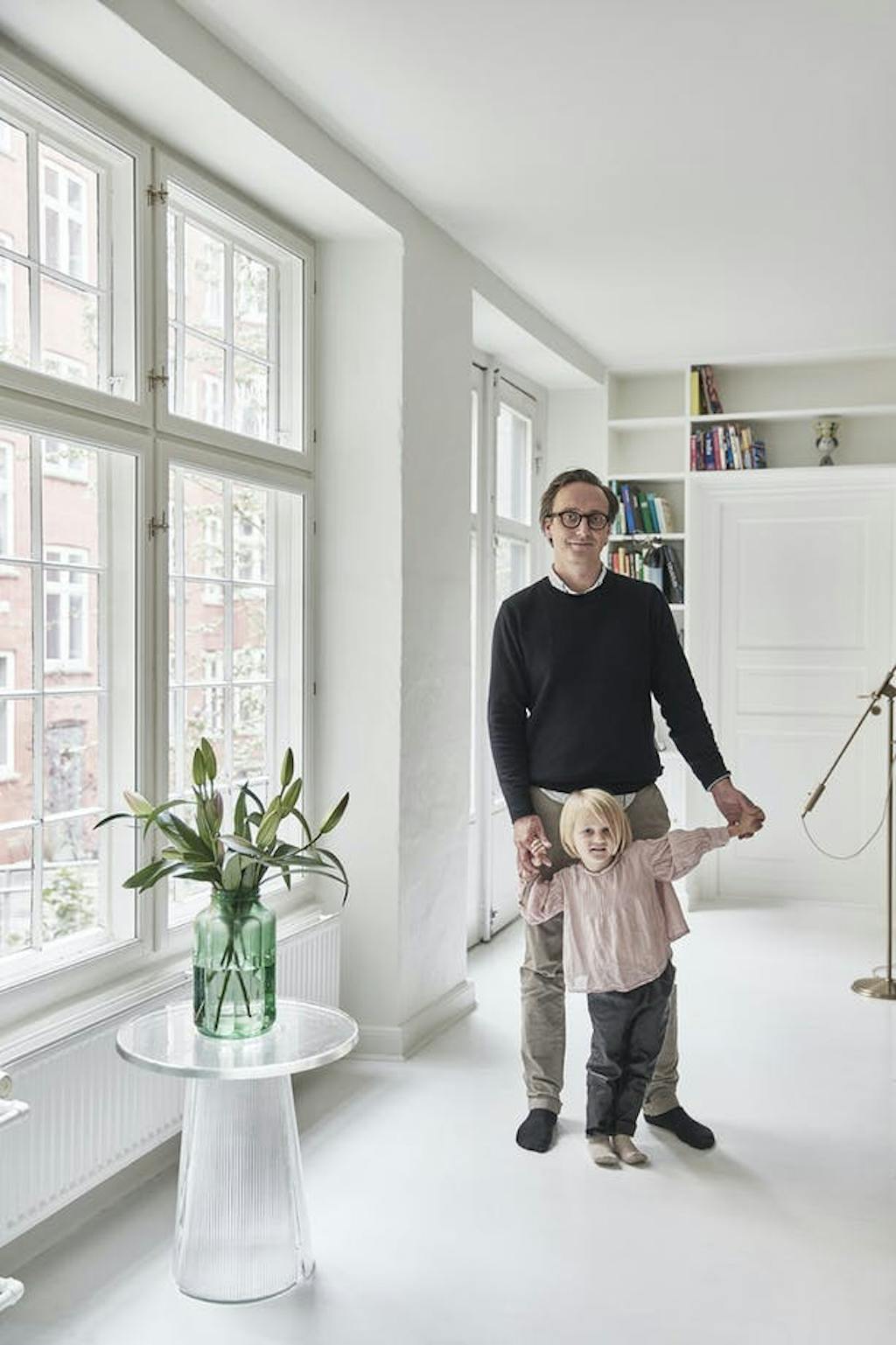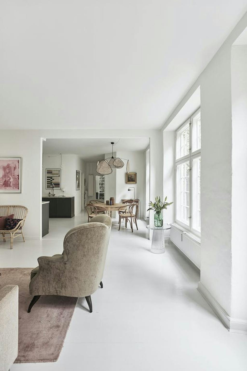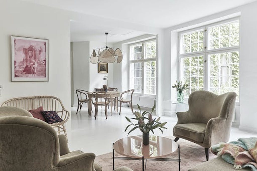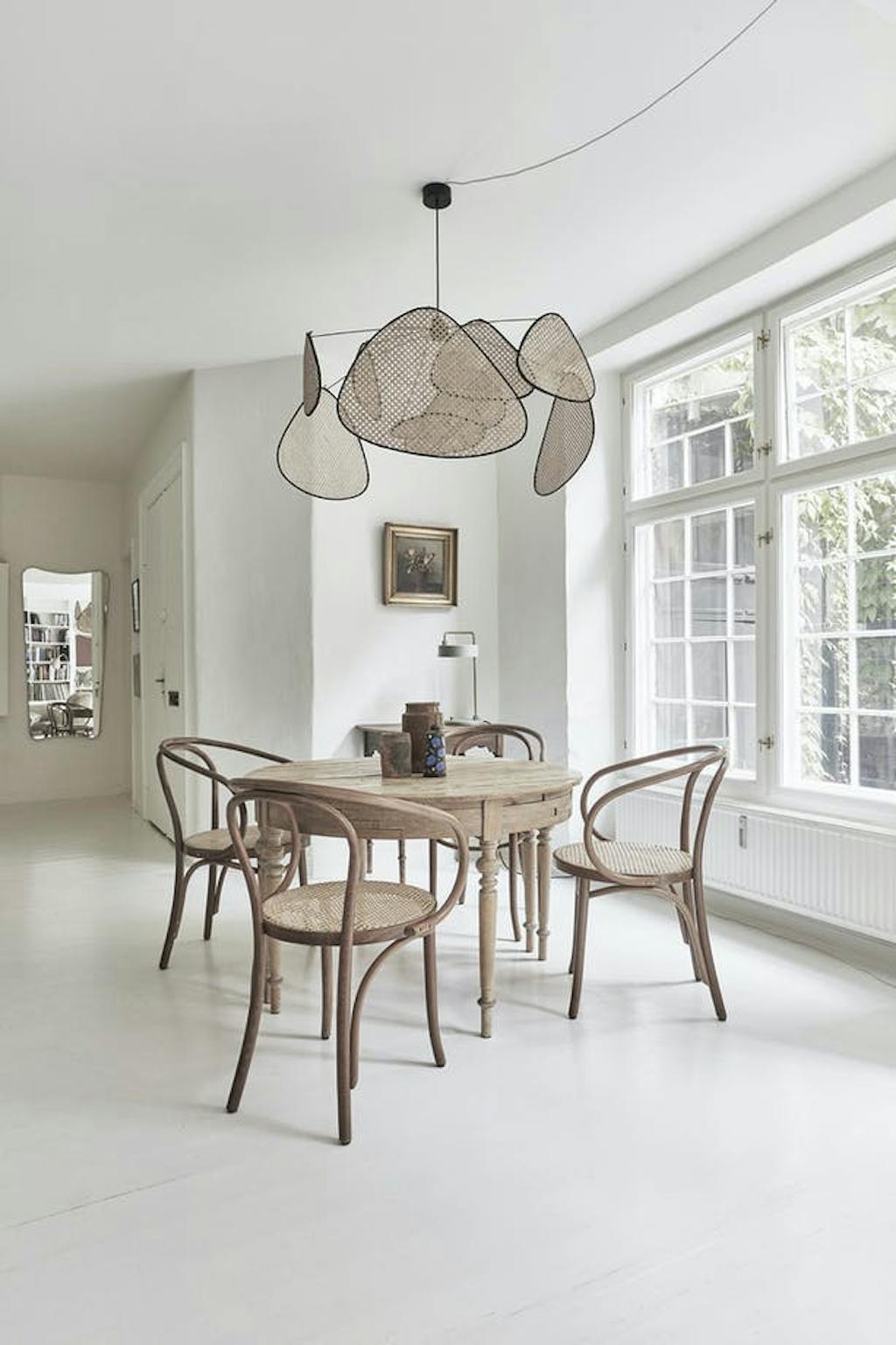 DoorIn het huis van Kasper en Signe mag je zien dat er geleefd wordt. De geloogde boerentafel komt van een vlooienmarkt en de Thonet-stoelen zijn gekocht bij de lokale woonwinkel Beau Marché, waar ook de rieten lamp en de tafellamp Petit Machine vandaan komen. Het bloemenschilderij van Yelva Vermehren uit begin 20e eeuw krijgt iets moderns doordat er veel ruimte omheen zit en gaat een samenspel aan met de spiegel van Gio Ponti uit 1933.