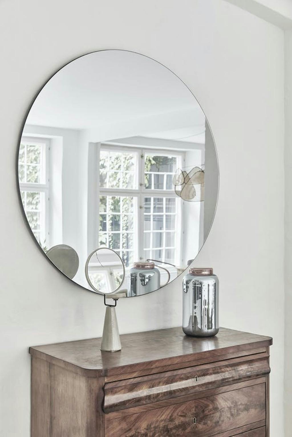 Het stel houdt van mahonie, ook al is die houtsoort in de populaire designen interieurscene uit de gratie. Ze vinden het een mooi idee om meubels te gebruiken die meer dan 100 jaar oud zijn – die zijn bewezen degelijk. De mahoniehouten ladekast is gecombineerd met een grote ronde spiegel van House Doctor. De glazen vaas is van Sebastian Herkner en komt net als de kandelaar van Beau Marché.