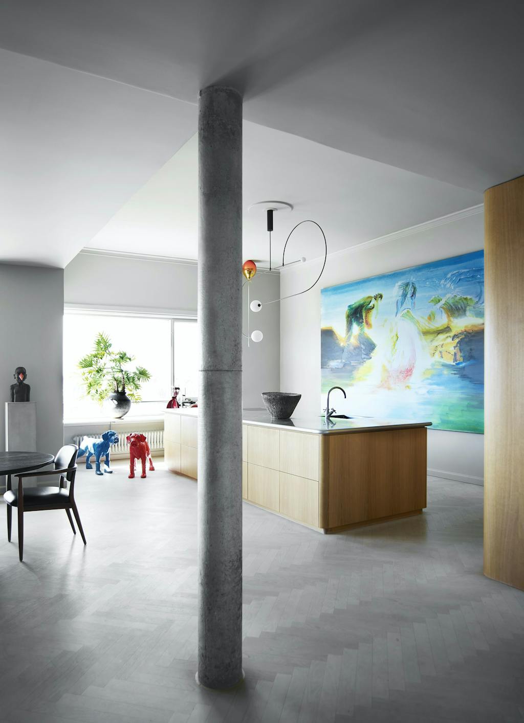 De Deen Bo Bech is vooral bekend als chef-kok en restaurateur. Niet veel mensen weten dat hij ook kunstverzamelaar is. In zijn indrukwekkende appartement, dat na de renovatie een rauwe, minimalistische uitstraling heeft gekregen, vormen de opvallende, kleurrijke kunstwerken een mooi contrast met de verder strakke wanden.