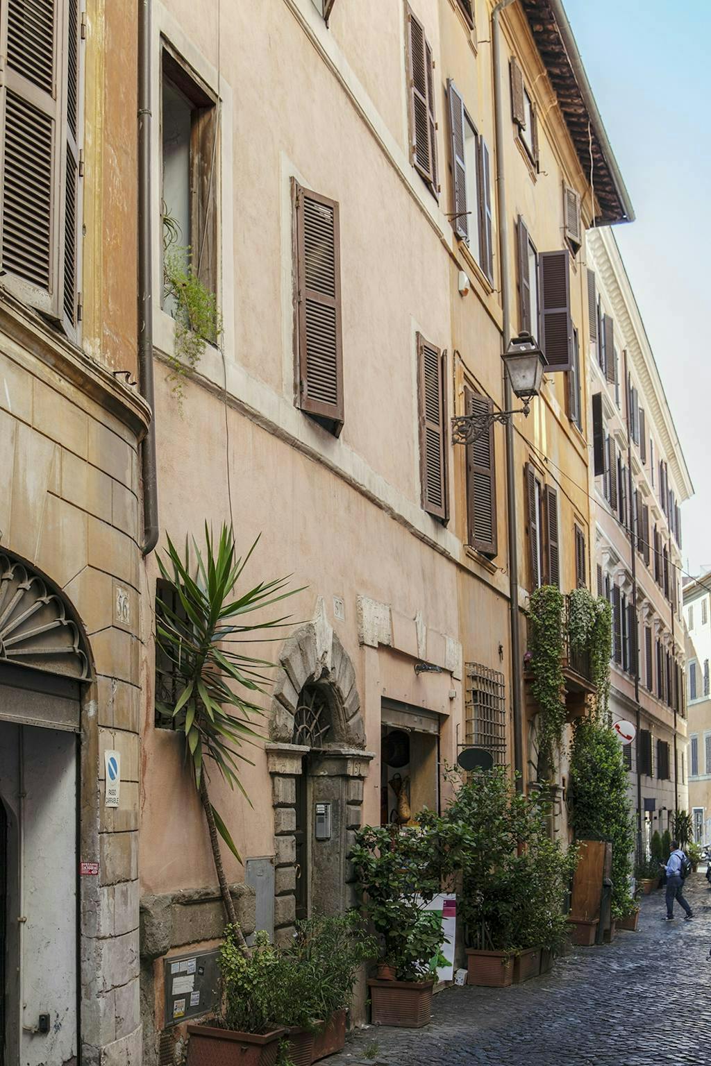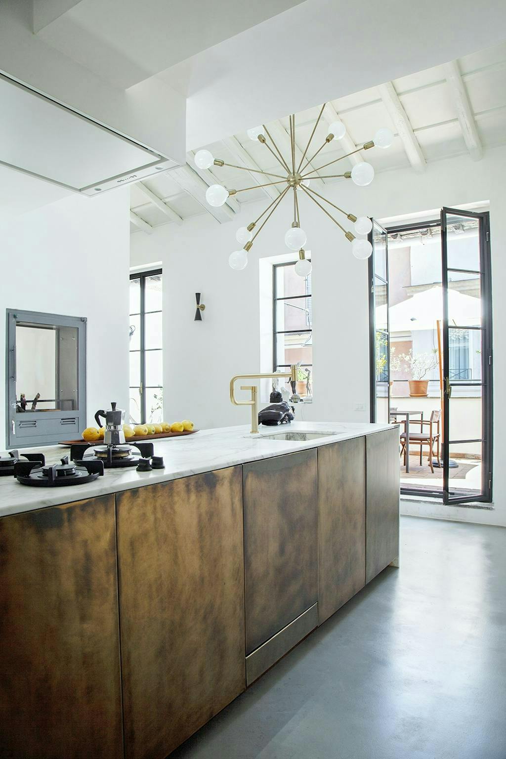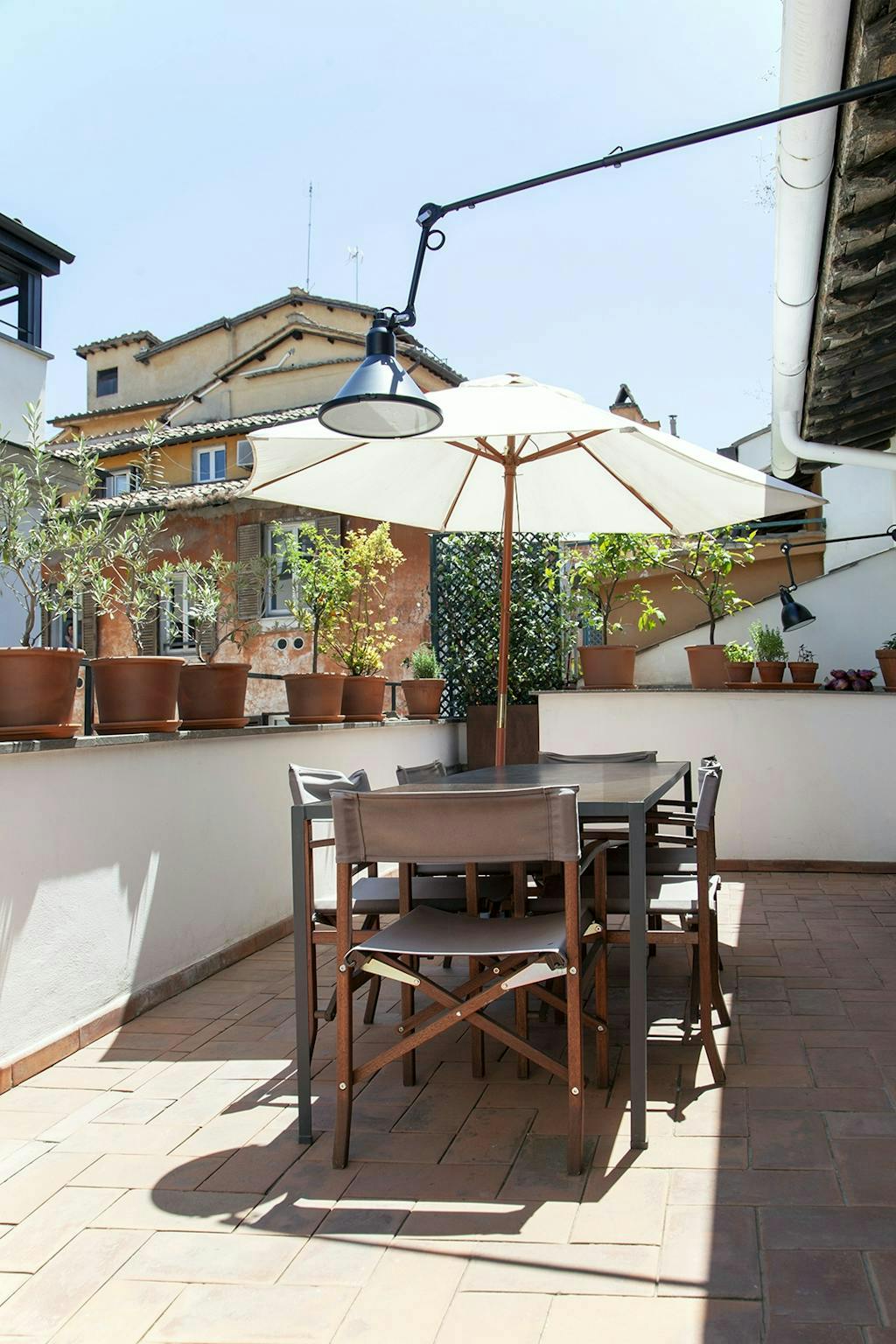 De meeste terrassen in Rome bevinden zich meestal op het dak, wat betekent dat je enkele meters op een ladder moet balanceren met borden, glazen en borden, dus de mogelijkheid om het terras als een verlengstuk van de keuken te maken was een groot pluspunt voor deze woning.