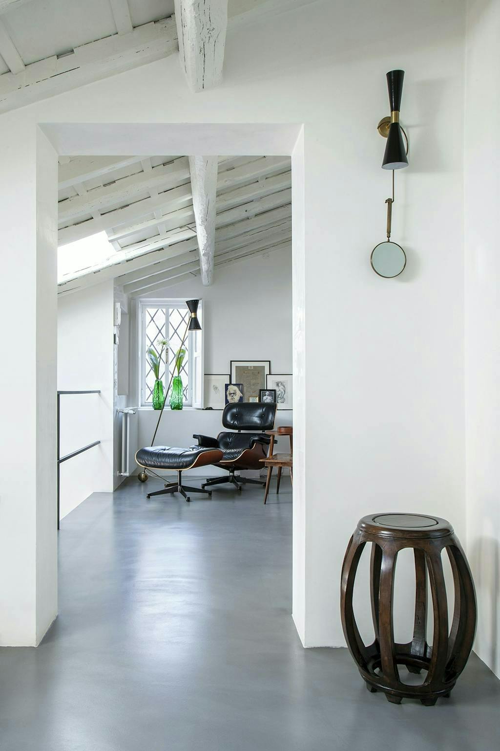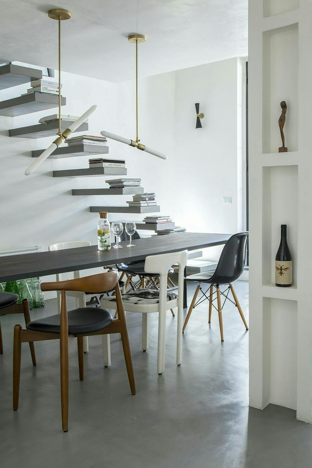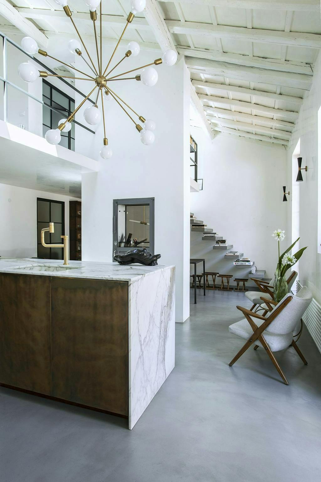 Het Italiaanse marmer vormt een aanvulling op de rest van de inrichting van het appartement, die een strakke, Scandinavische sfeer heeft met tijdloze Deense klassiekers gecombineerd met vondsten uit lokale favoriete winkels die gespecialiseerd zijn in Italiaanse meubels en lampen uit de culturele hoogtijdagen van het land, de Stilnovo beweging uit de jaren 1950 en 1960.