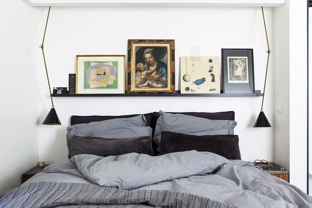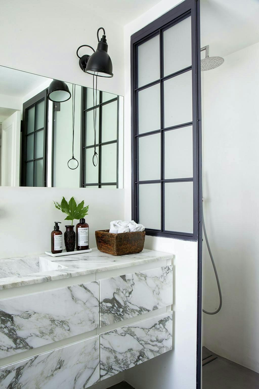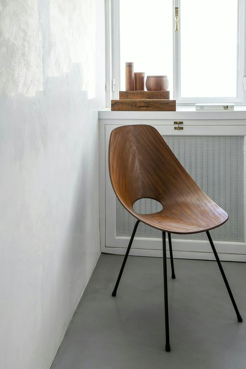 Het Italiaanse marmer vormt een aanvulling op de rest van de inrichting van het appartement, die een strakke, Scandinavische sfeer heeft met tijdloze Deense klassiekers gecombineerd met vondsten uit lokale favoriete winkels die gespecialiseerd zijn in Italiaanse meubels en lampen uit de culturele hoogtijdagen van het land, de Stilnovo beweging uit de jaren 1950 en 1960.