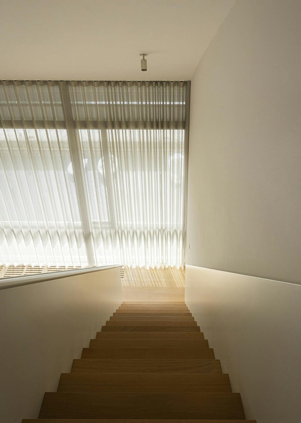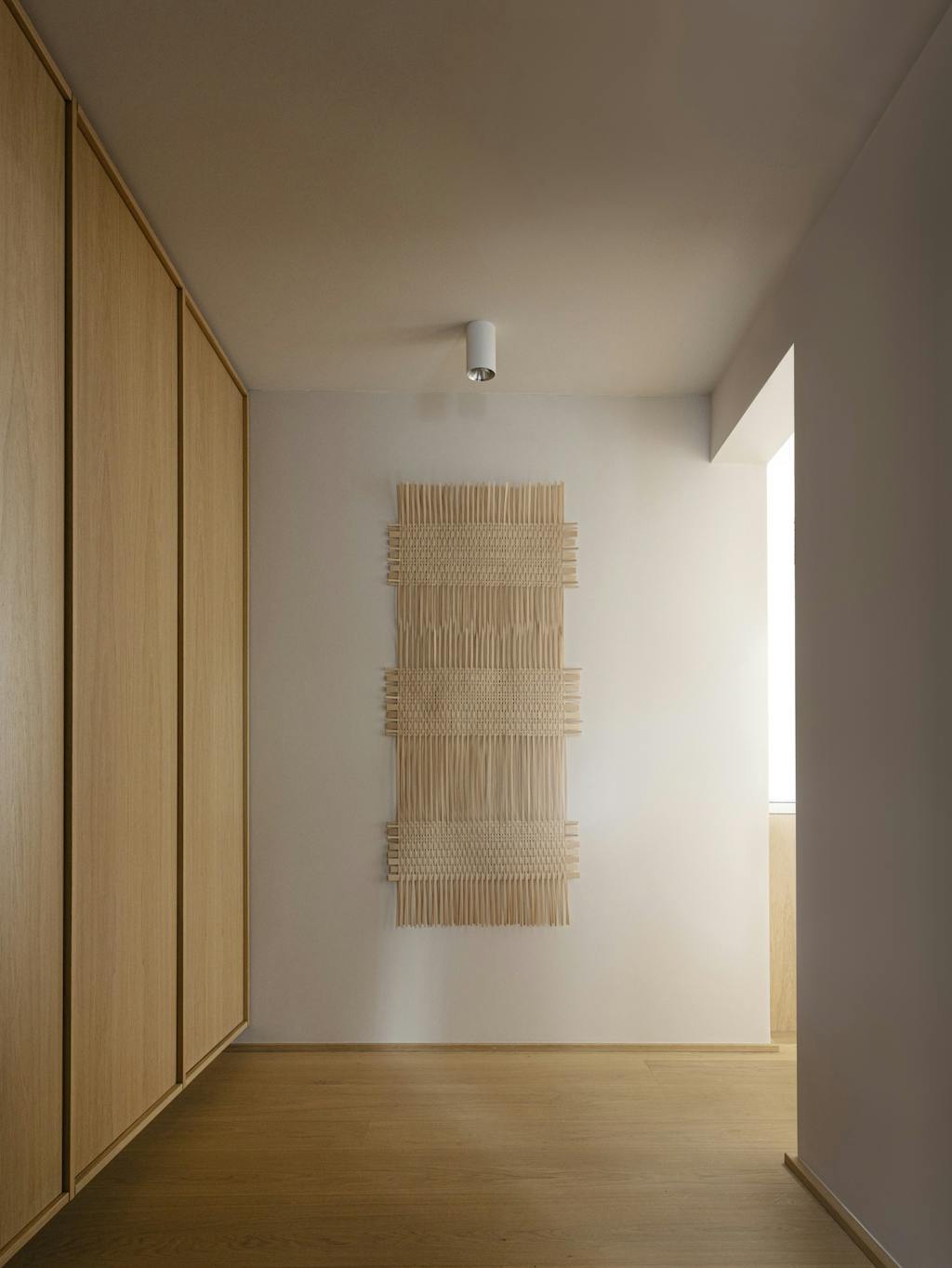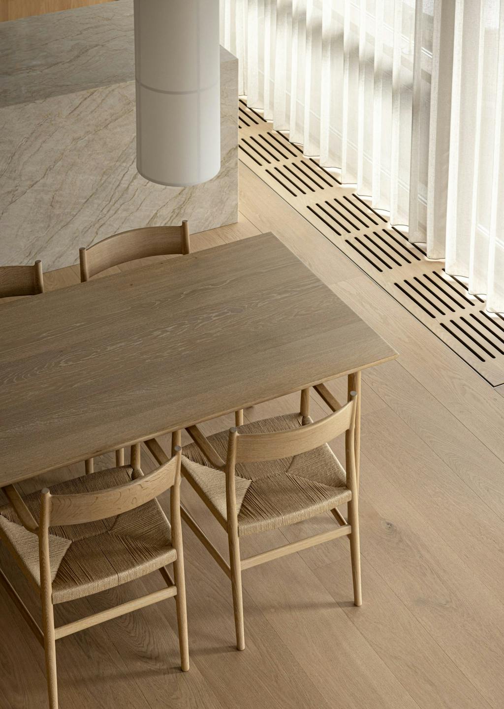 Het interieur is een eenvoudige samensmelting van Japanse en Scandinavische designelementen, die uitnodigen tot rust en harmonie in het alledaagse leven. Om deze visie kracht bij te zetten, worden in het hele huis op prominente wijze natuurlijke materialen gebruikt. De warme, organische textuur van eikenhout voegt een laag van natuurlijke schoonheid en tijdloze aantrekkingskracht toe.