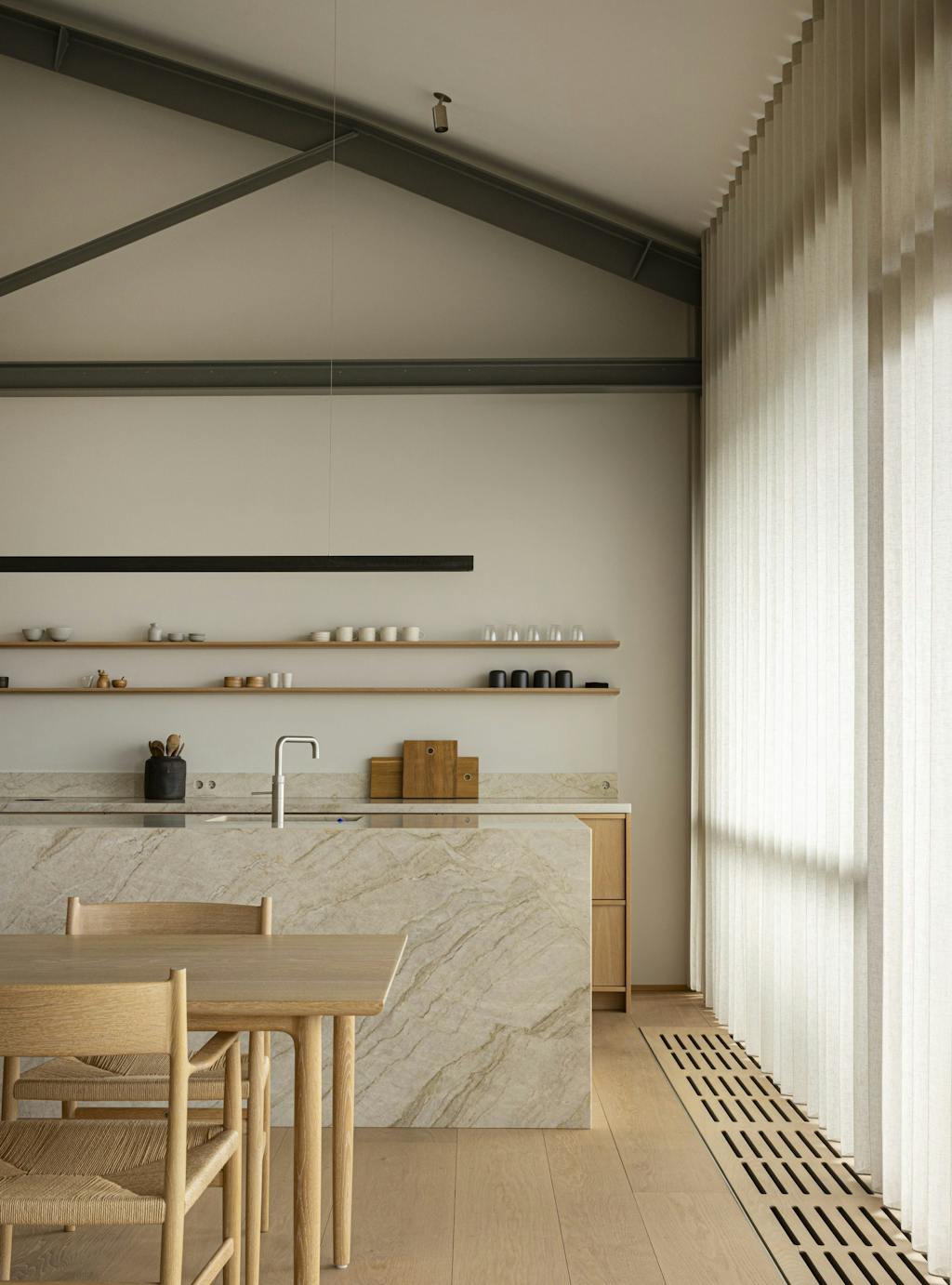 Om een interieur uniek te maken, haalt Norm Architects inspiratie uit de locatie en de specifieke behoeften van de eigenaren. Voortbordurend op het industriële erfgoed van de Torpedohallen zijn subtiele, duurzame elementen zoals roestvrij staal verwerkt in handgrepen, armaturen en verlichting om de ruimte een verfijnd accent te geven.