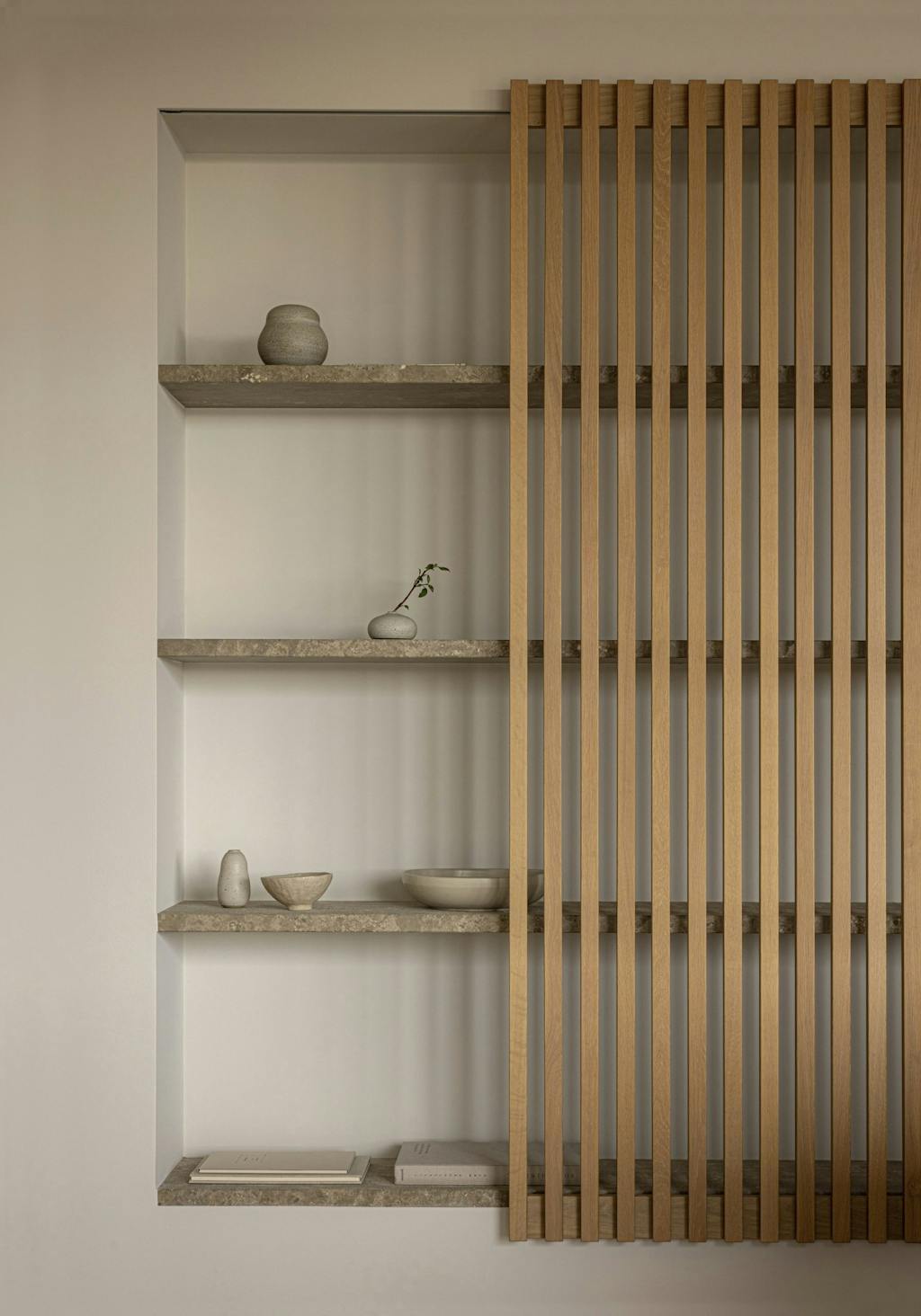 - Hout brengt warmte en een natuurlijke textuur in een ruimte, het aardt de ruimte op een manier die helpt bij het creëren van een rustgevende, tactiele ervaring. Het is een tijdloos materiaal dat zich goed leent voor een serene en comfortabele sfeer, zegt Peter.