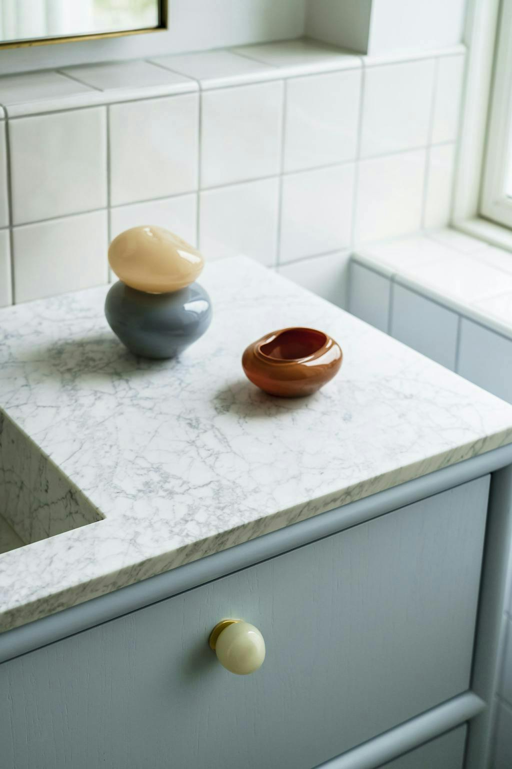 badkamer en gastentoilet zouden het meeste toevoegen. En er zijn een paar kleuren die door de jaren met ons meegaan, waaronder blauw. Dus we waren er al snel uit dat de keuken lichtblauw moest worden. Samen met de geeltinten van het marmeren mozaïek op de badkamervloer zetten die kleuren de toon voor de rest van het huis, zegt het stel.