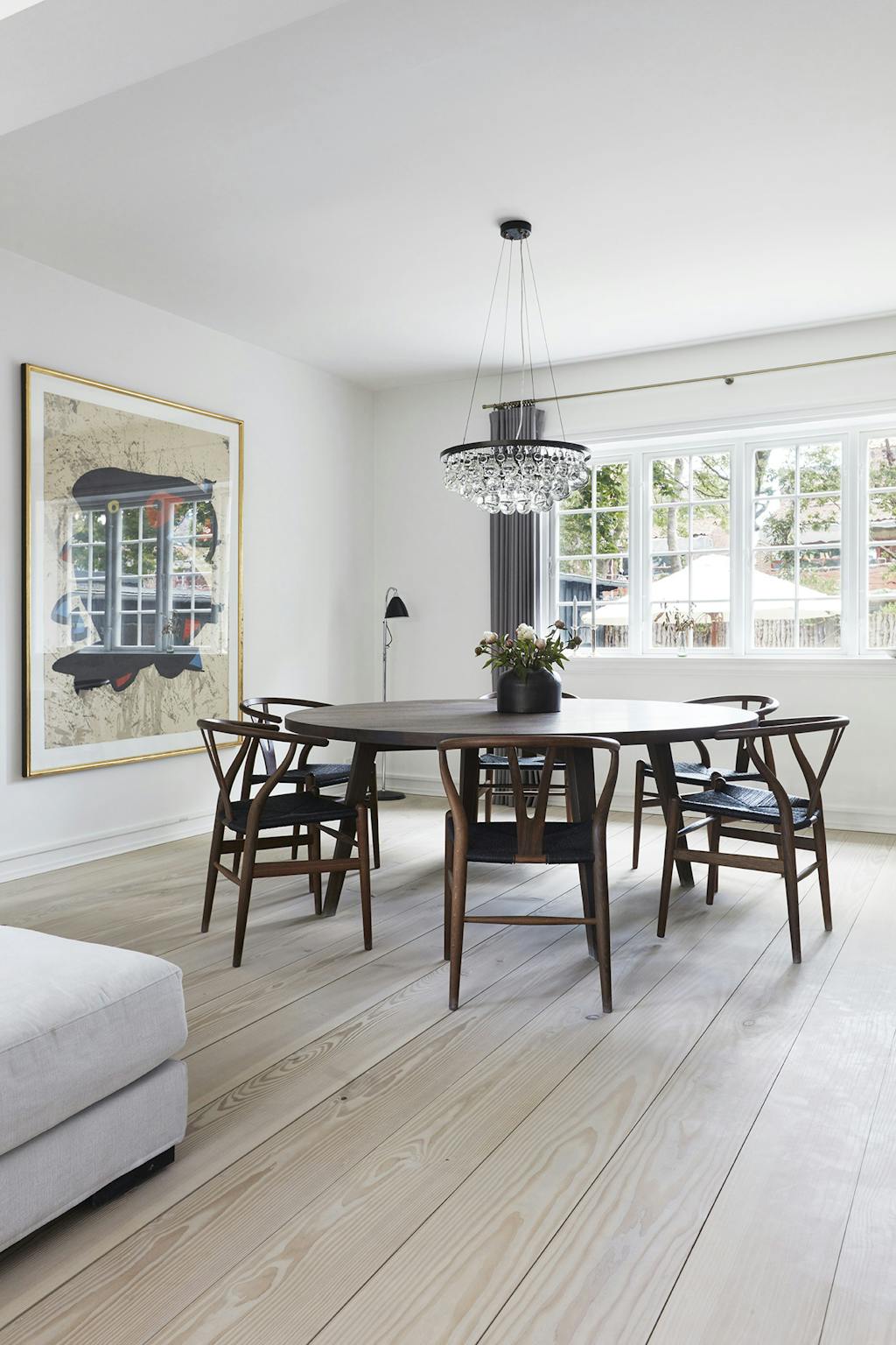 De eettafel is van wengéhout en gemaakt door een meubelmaker. Eromheen staan klassieke donkere Y-stoelen van Hans J. Wegner. Aan de wand hangt een litho van Miró, die Birgitte heeft geërfd van haar ouders. In de muur erachter zijn speakers ingebouwd die je kunt bedienen met je telefoon.