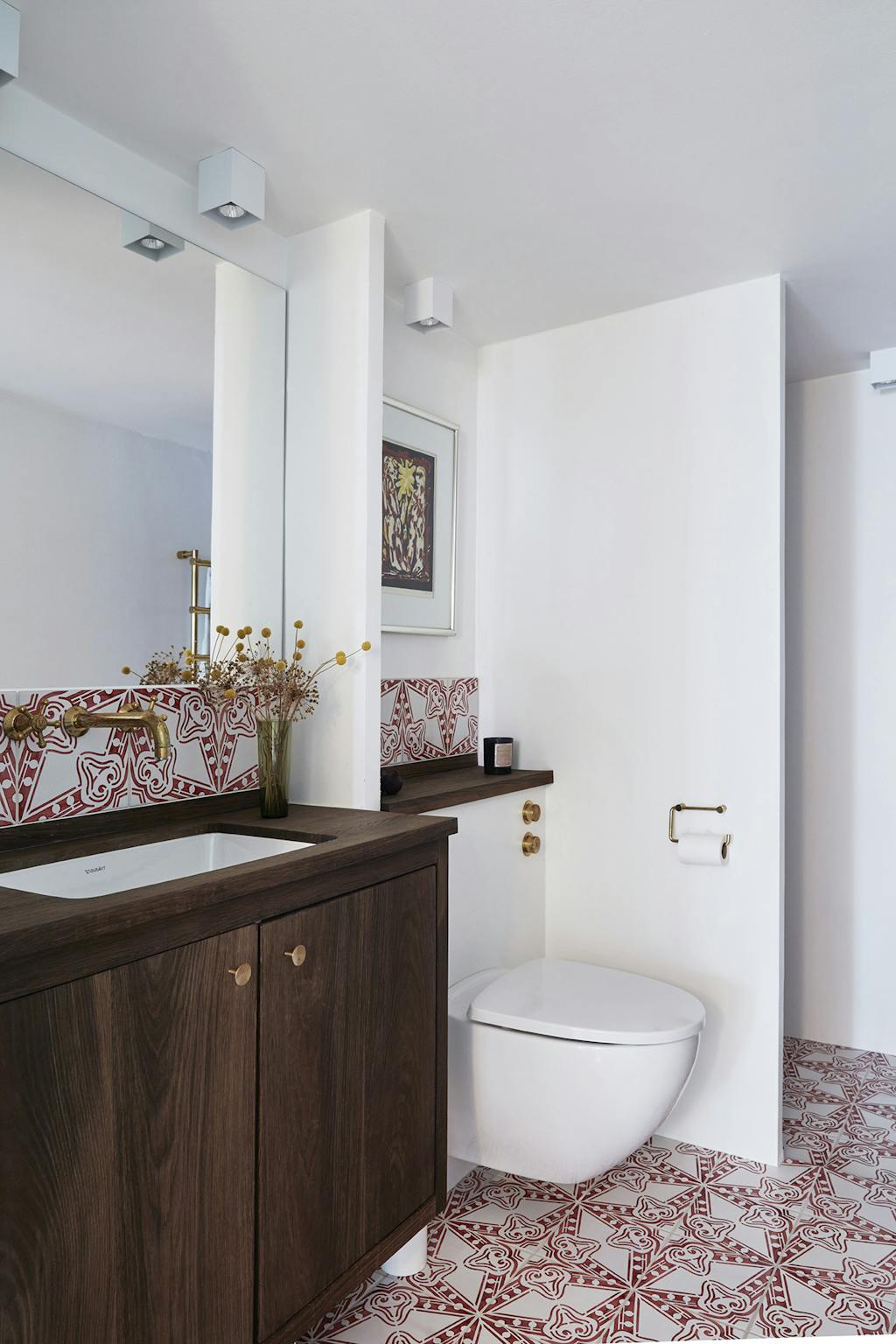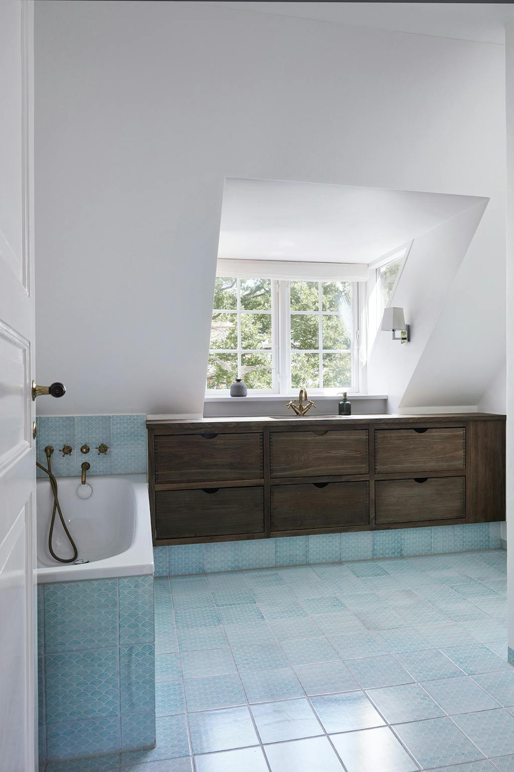 De klassieke uitstraling krijgt tegenspel in de in totaal vier badkamers van het huis, die aangekleed zijn met verschillende kleurrijke tegels van lavasteen van Made a Mano. Vooral de badkamer op de eerste verdieping valt op, met zijn turquoise kleur. Maar hij doet toch elegant en rustig aan dankzij de solide badkamermeubels van hout en de messing kranen van Toni Copenhagen.