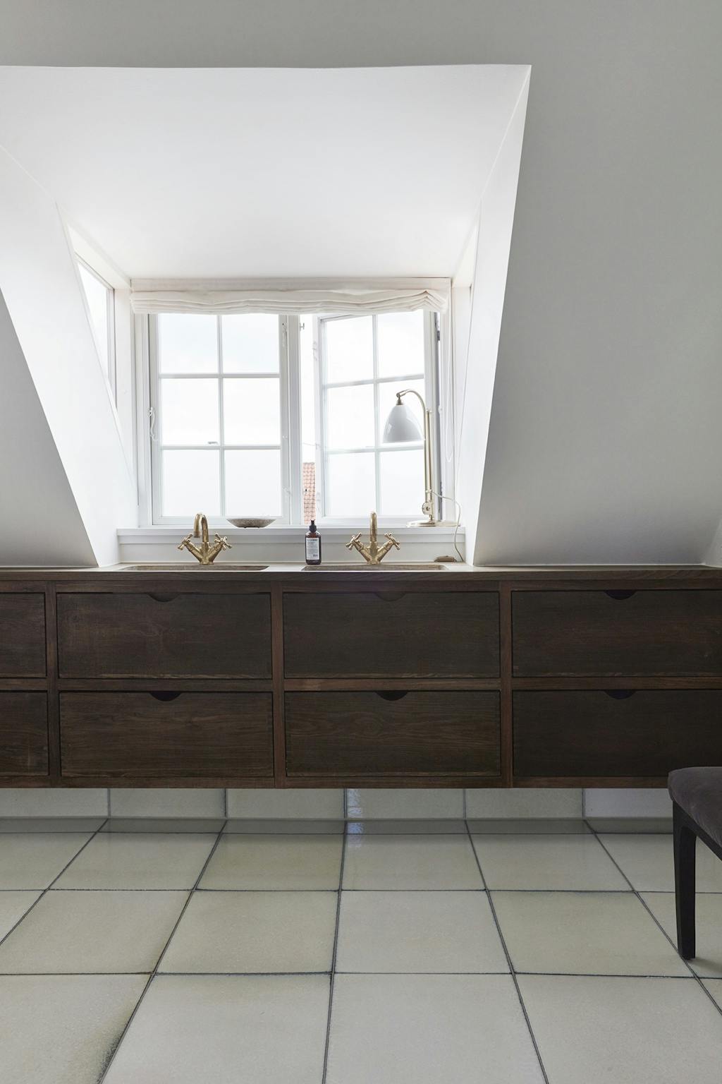 De grijze keuken van Kitchen Tailor is van hout en heeft kasten met paneeldeuren en messing grepen en kranen, die bij de geschiedenis van het huis passen. Voor Birgitte en Andreas, die vroeger voor wit op wit zouden gaan, is een grijze keuken met een donker werkblad een moedige keuze.