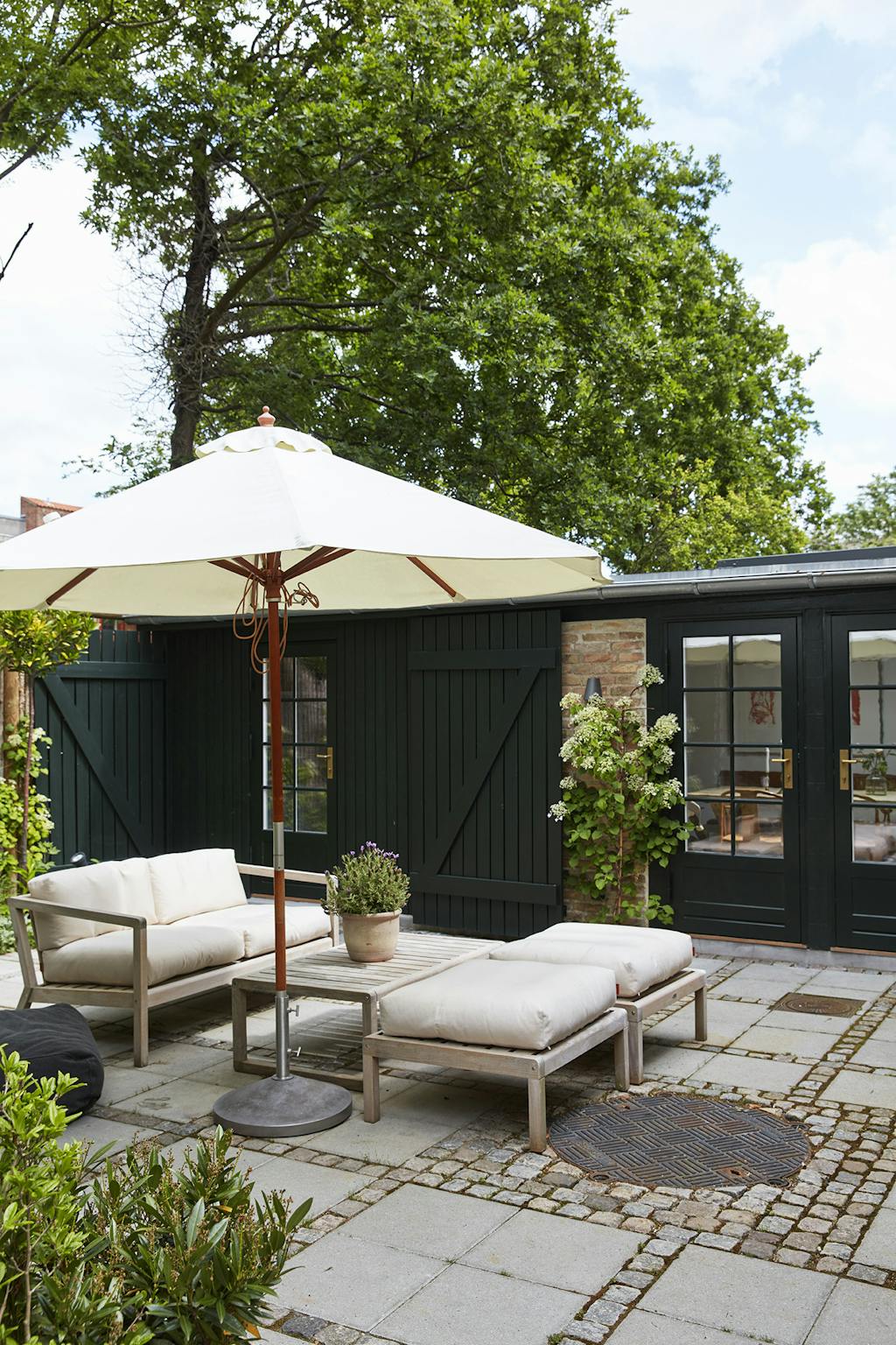 Achter het huis ligt nog een kleine oase, waar je heerlijk uit de wind kunt zitten. Het kleine bijgebouw fungeert als werkplaats en gastenverblijf.