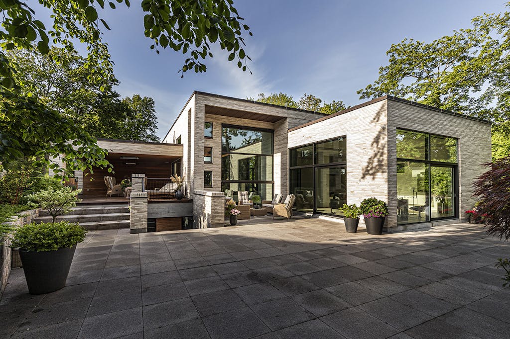 Buitenaanzicht van het huis, waar oorspronkelijk de stal was. Het perceel is drie hectare groot. De nieuwe interpretatie van het stalgebouw meet 300 m². De stijl is eenvoudig en hoogwaardig.