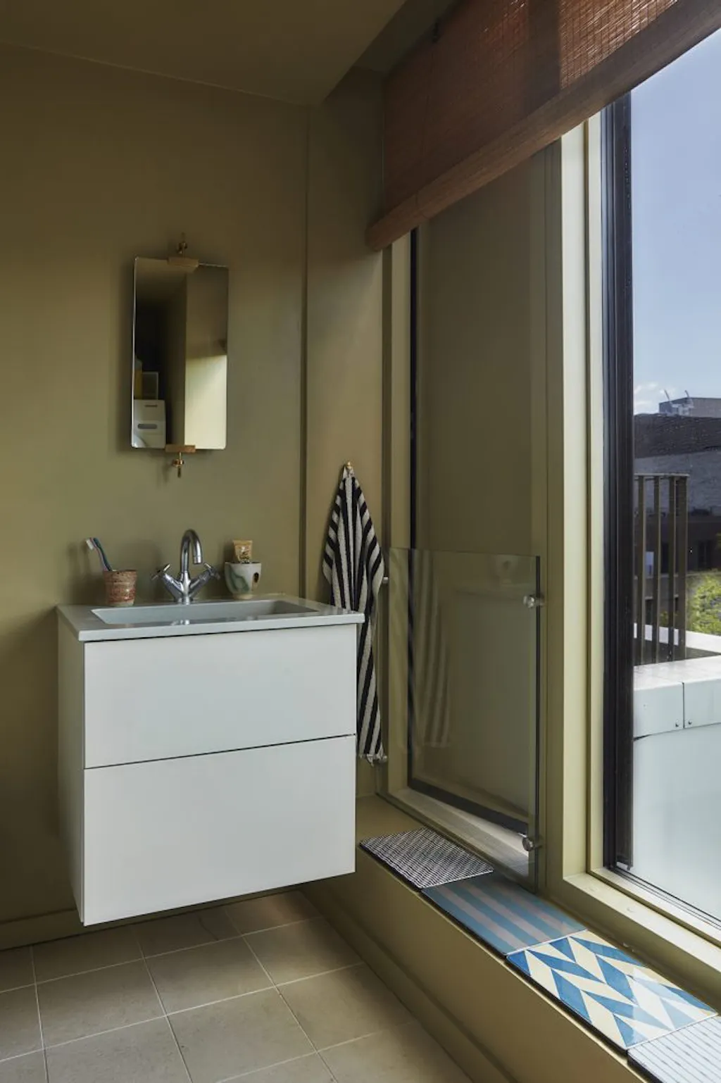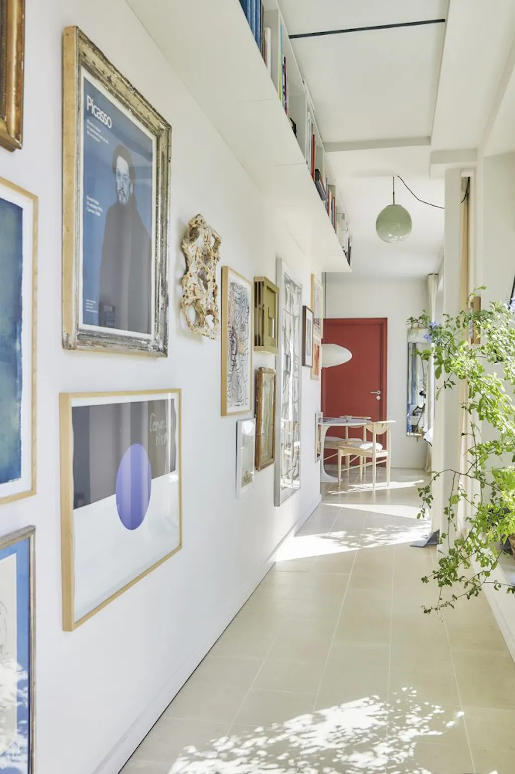 ‘Wit kan rustig zijn, maar hier kreeg ik er hoofdpijn van. Ik werk nu 24 jaar met kleur en heb geleidelijk mijn eigen aanpak ontwikkeld om een ruimte kleur te geven. Maar hier moest ik bijna alles wat ik had geleerd, weer loslaten.’ Ze besefte al snel dat ze het licht moesten dempen en filteren om de rust en warmte te bereiken waardoor oppervlakken een sfeervolle dialoog kunnen aangaan met kunst en de rest van het interieur. De witte wanden kregen een heel zachte, lichtroze tint, Under My Skin, als basis. Daarnaast werkte ze met accenten, zoals een bruine wand in de woonkamer, framboosrode deuren en plafonds in een koele, blauwige wittint. De naden tussen de betonplaten op het plafond kregen verschillende tinten, die het witte oppervlak doorbreken en de grote ruimte indelen en zo de functie van elke zone ondersteunen. Je zou de opvallende kleurstrepen op het plafond haast kunnen zien als een moderne tegenhanger van sierstuc.