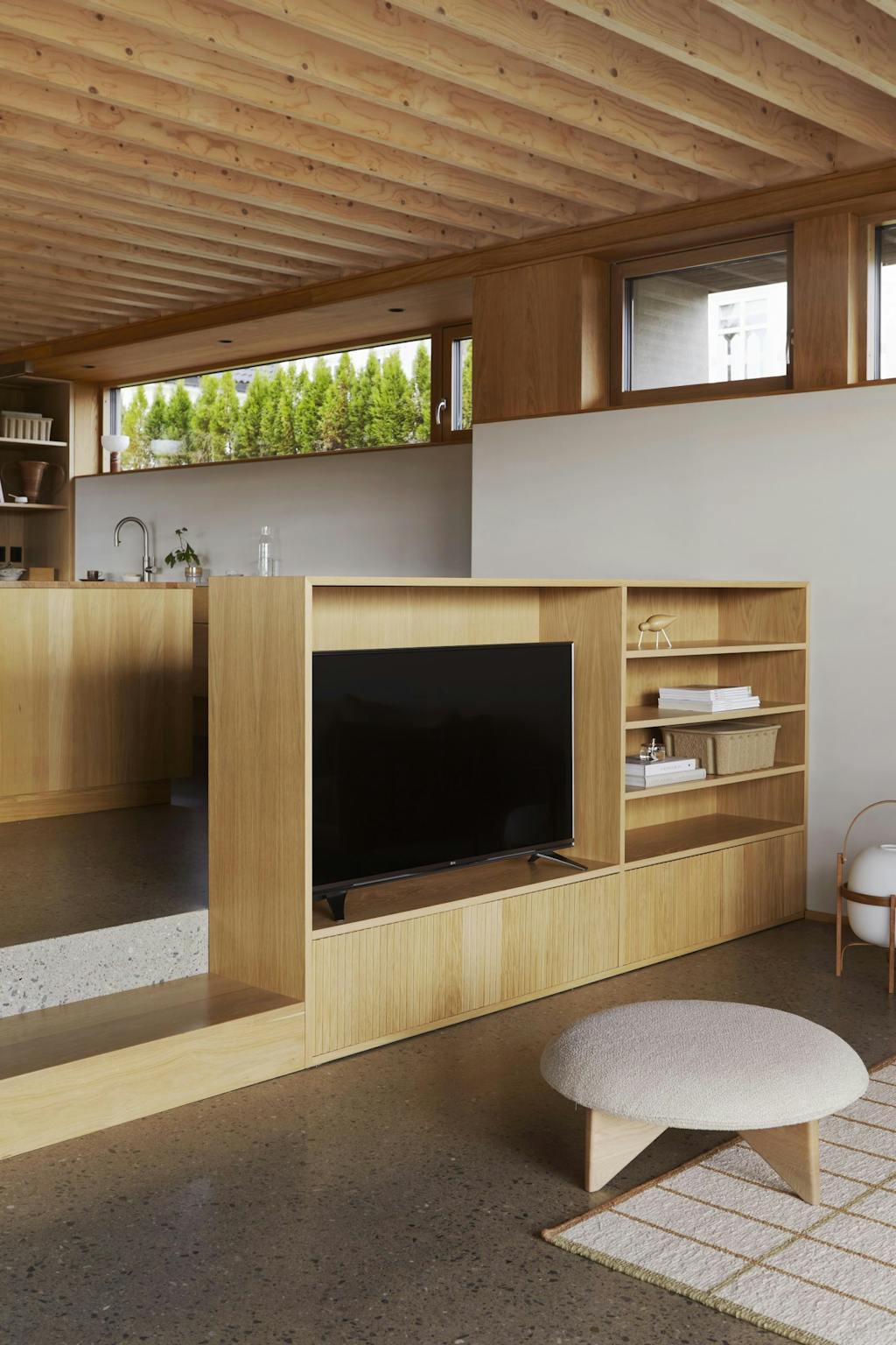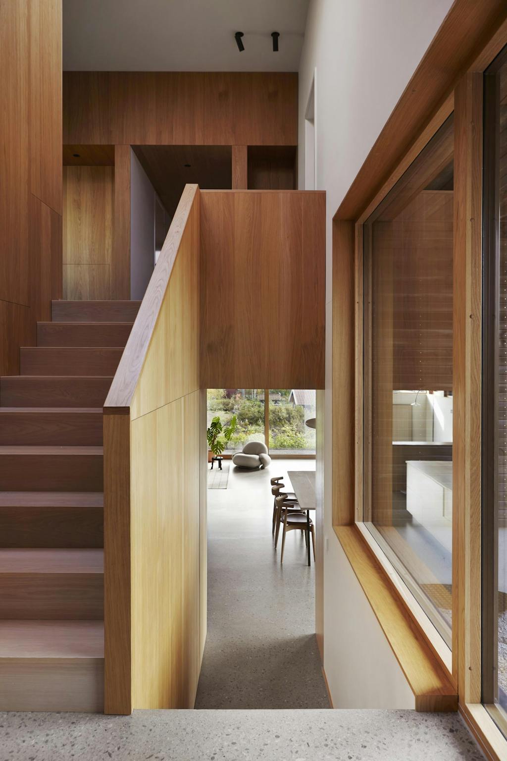 Ze zit aan de keukentafel en kijkt uit over het terras. De glazen schuifdeuren geven direct toegang tot het terras, en vanuit de woonkamer, die twee traptreden lager ligt dan de keuken, stap je rechtstreeks de tuin in. Vanuit de keuken loop je zeven traptreden op naar de hal, met een plafondhoogte van ruim vier meter. En dankzij het enorme dakraam dat de ruimte van daglicht voorziet, lijkt het hier nog hoger. Al die niveauverschillen en het royale dakraam stonden echter niet op het wensenlijstje voor de architecten.
