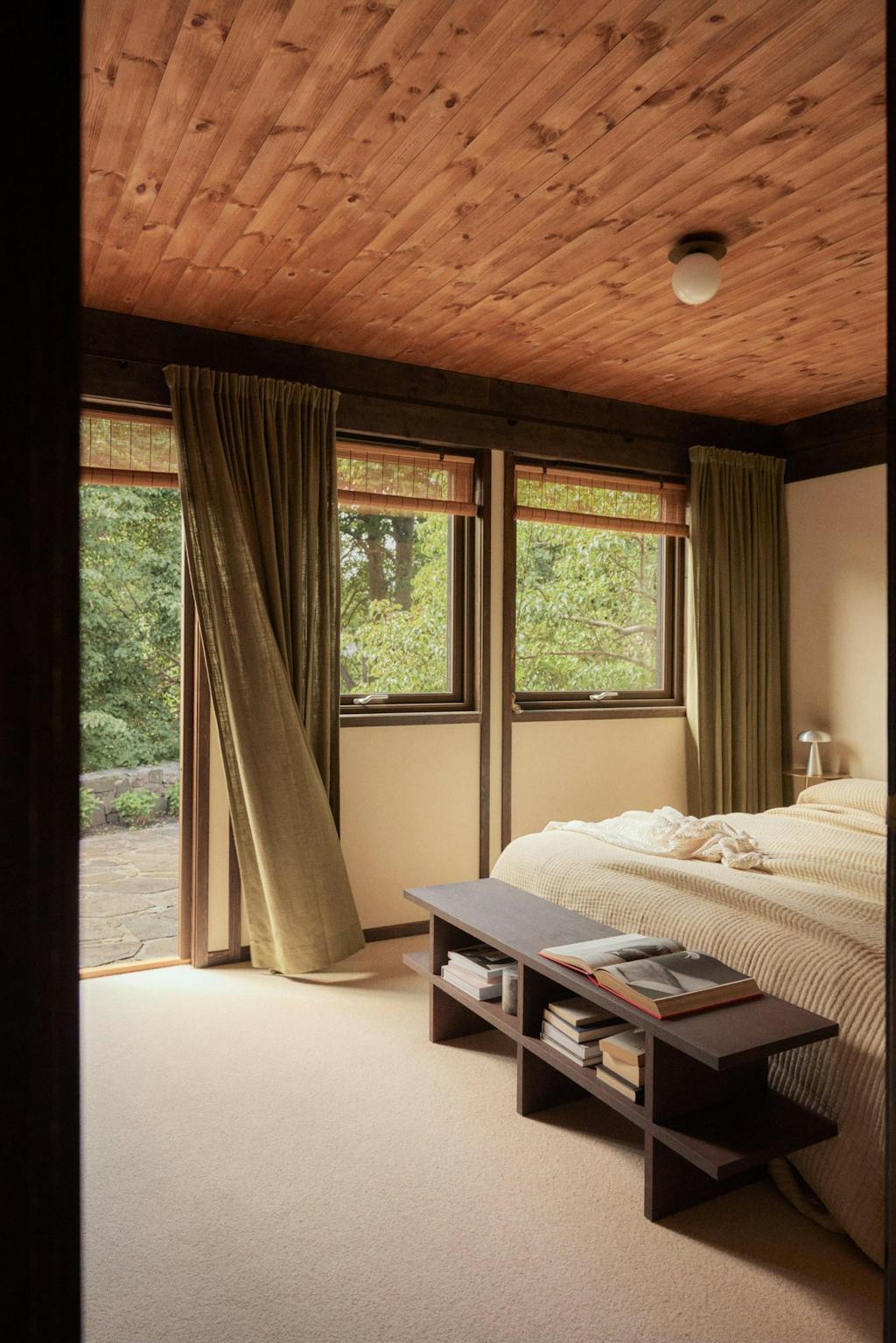 In de slaapkamer is een tussenmuur gesloopt om meer ruimte te creëren, en er zijn nieuwe ramen en een tuindeur geplaatst, omdat de oude verrot waren. De kakikleurige, geweven linnen gordijnen zijn van Gotain. De sprei Daze is van Ferm Living, net als het bankje Kona. De plafondlamp Liila is van Nuura.