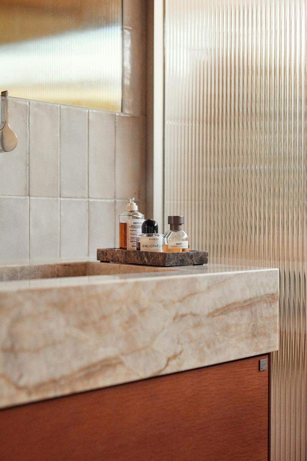 De wastafel is speciaal gemaakt door Stonedinavia, van dezelfde steensoort die gebruikt is in de keuken. De kast Vanity Finer komt van Drømmekjøkkenet.