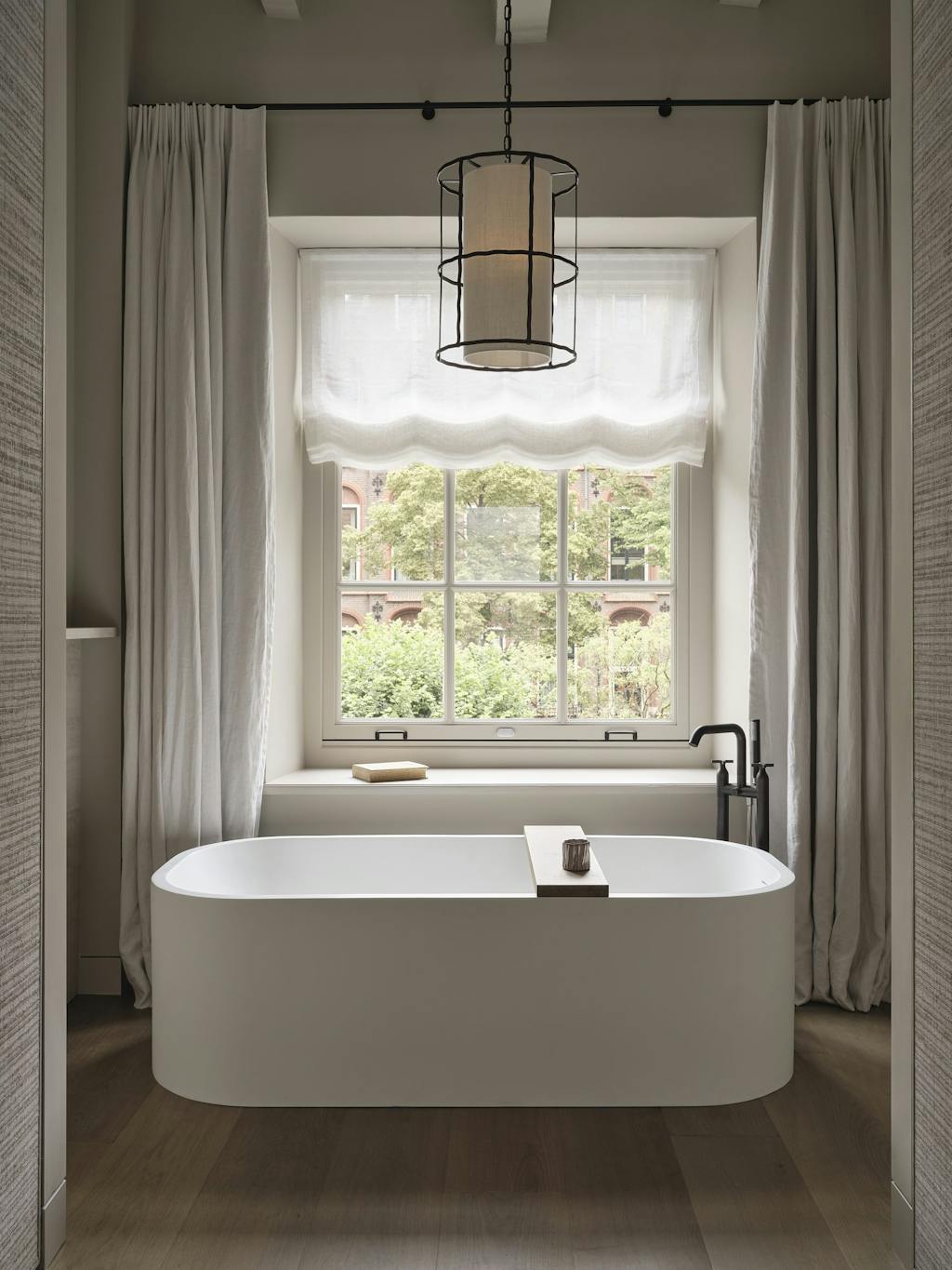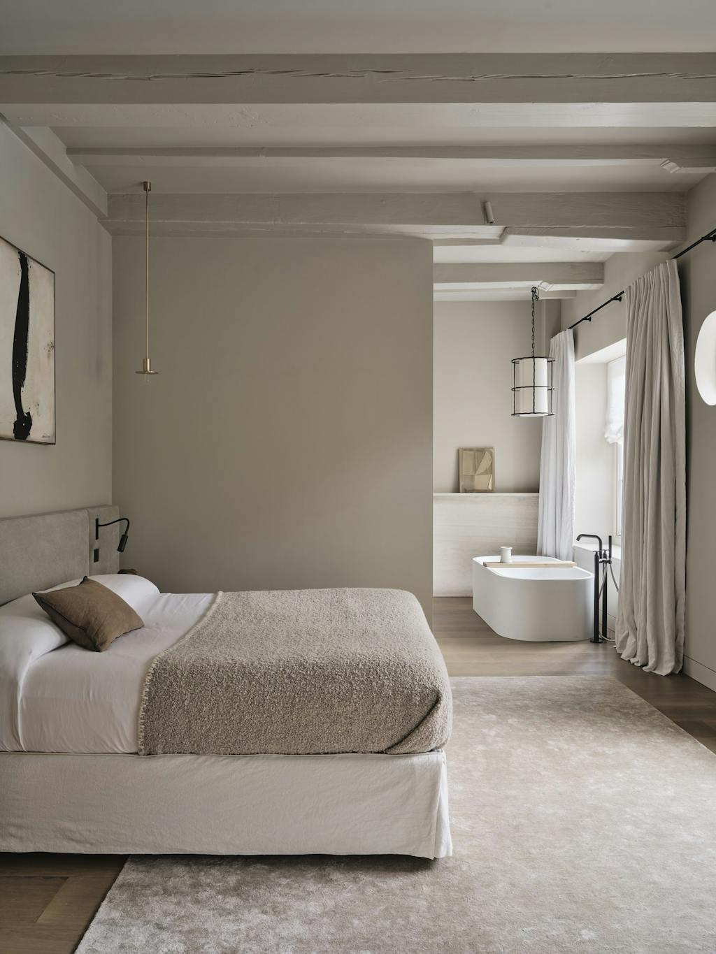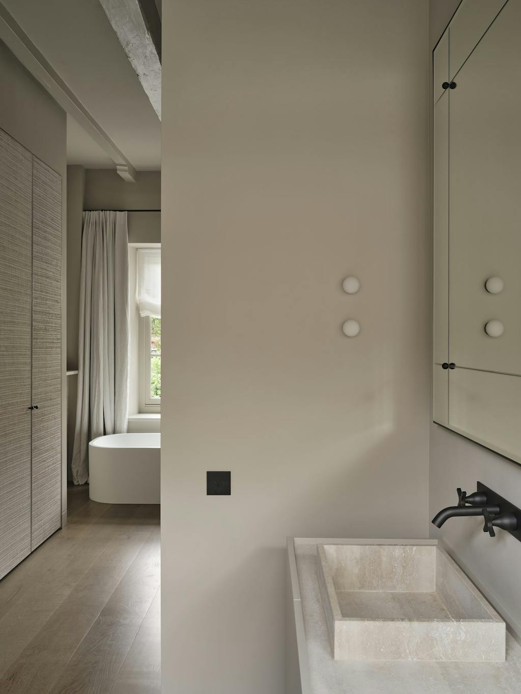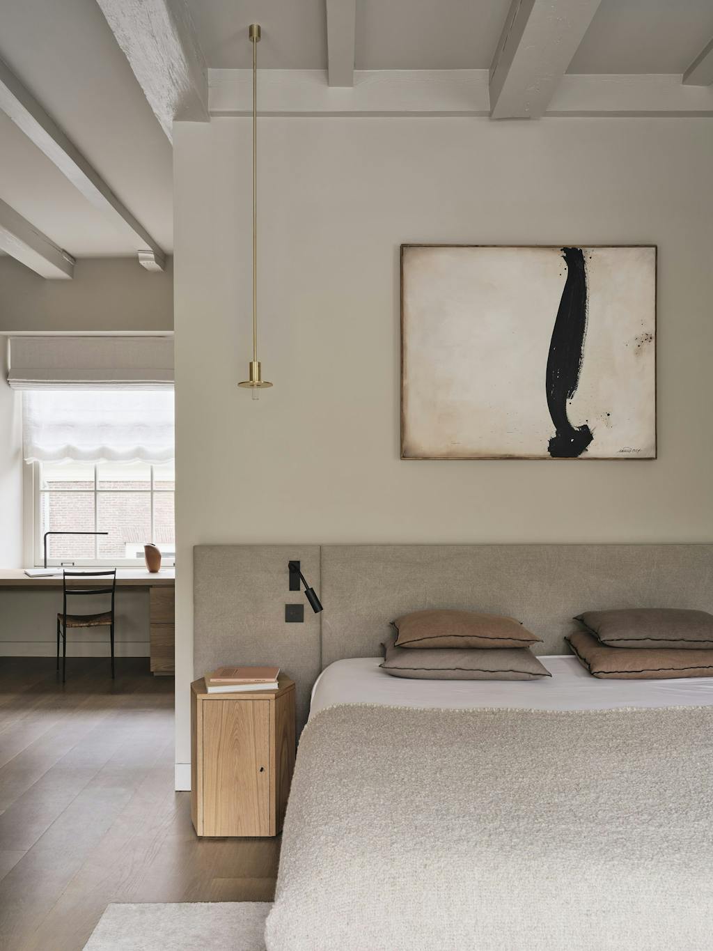 Op de bovenverdieping haalde Anne tussenwanden weg om de etage om te toveren tot één royale slaapverdieping die doorloopt in een ruime badkamer en een werkplek om te lezen of studeren. Ook hier doen een mix van zachte, romige kleuren, organische vormen en veel hout de trick.
