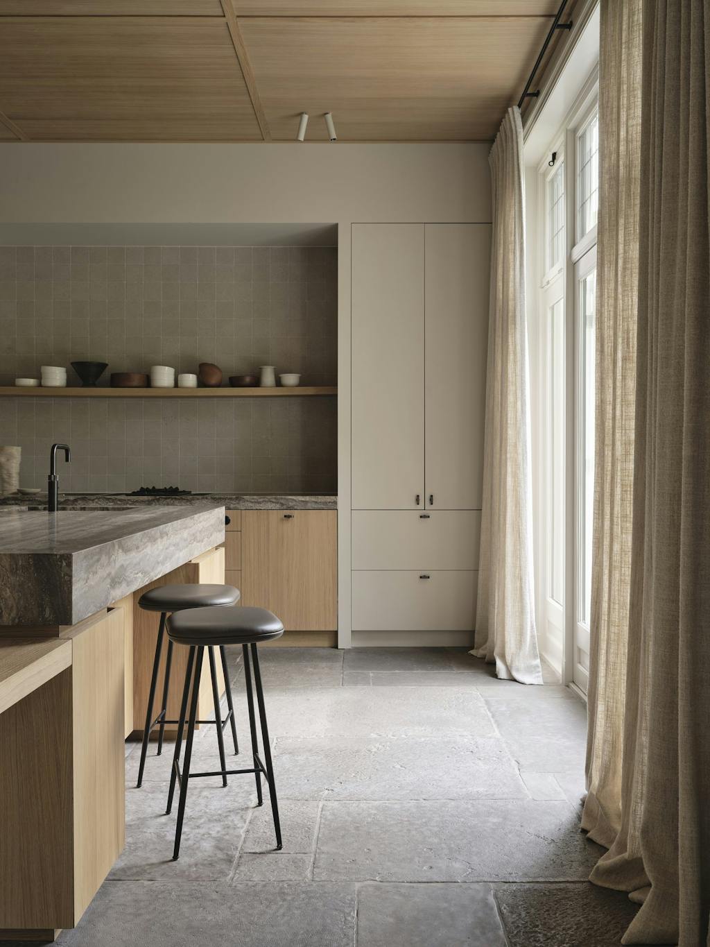 Haar idee om het plafond met hout te bekleden, pakte precies zo uit als ze hoopte: de ruimte werd er in één klap warm en behaaglijk van. De uitgekiende verlichting, de linnen gordijnen en het keukenmeubel van natuursteen en hout en vintage stoelen eromheen doen de rest.