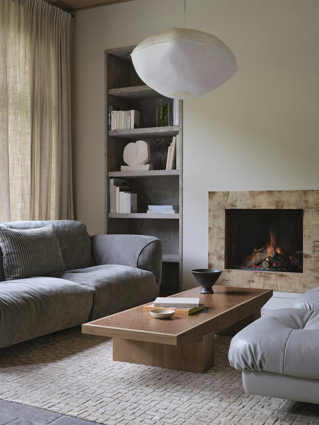 De twee royale fauteuils van Cassina bij de ingebouwde houtkachel zorgen voor het luxe suite-gevoel. Het is de ideale plek voor de bewoners om zich terug te trekken met een boek en zich te warmen aan het geborgen gevoel dat het nieuwe elán van hun oude, vertrouwde huis hen biedt.