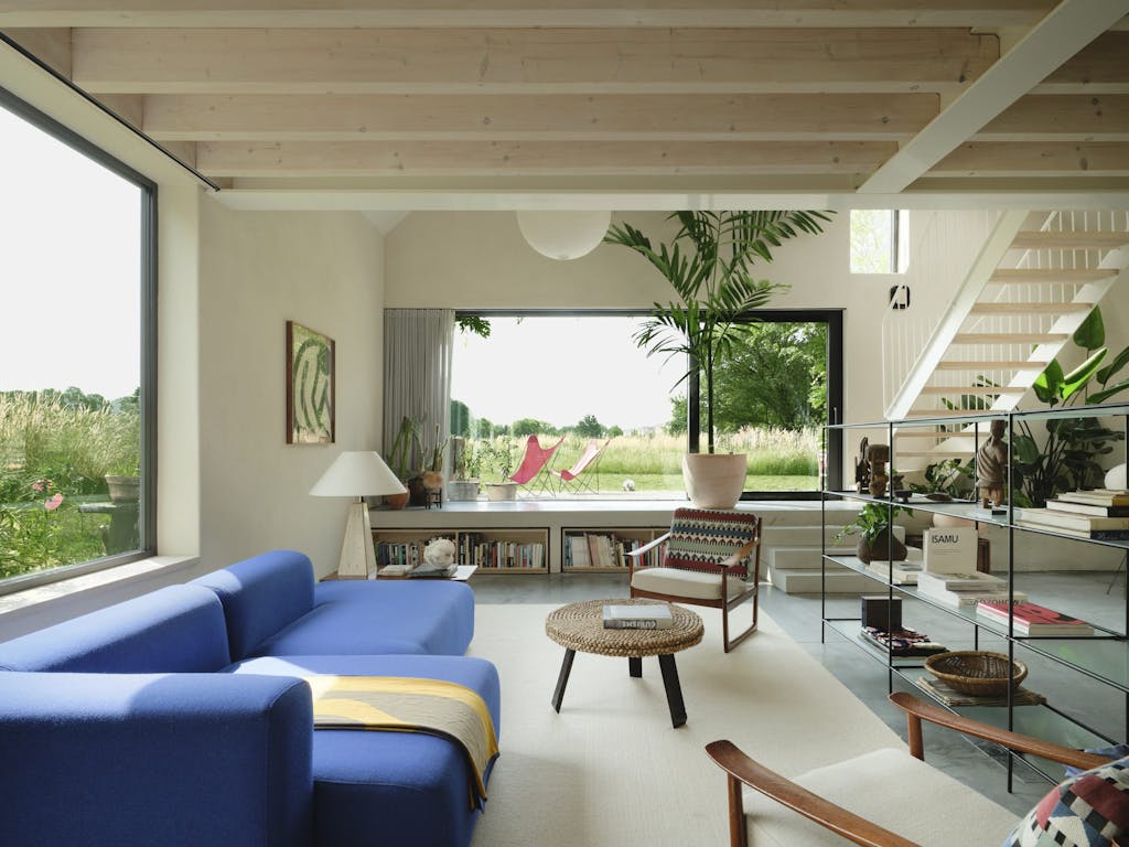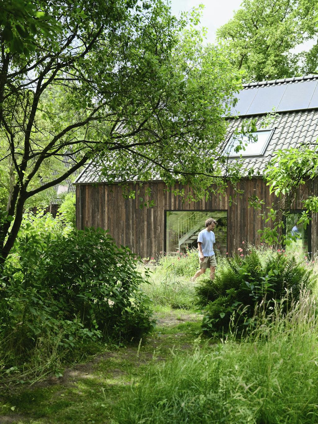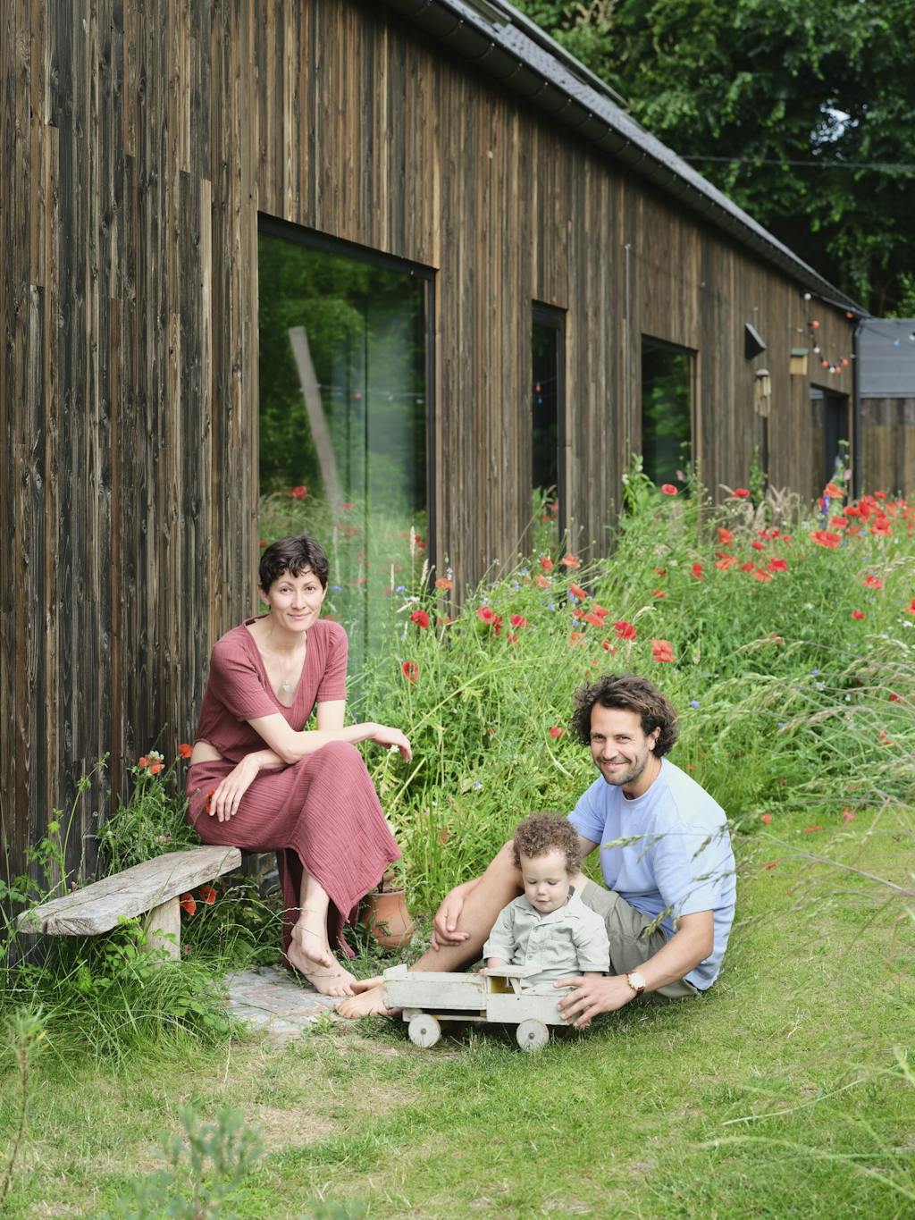 Het huis van Jesse, Jolijn en hun zoontje Paolo (1,5) wordt gekenmerkt door gevels van donker hout, die een verbinding creëren met de natuur en verwijzen naar de vroegere functie van het gebouw als machinestalling.