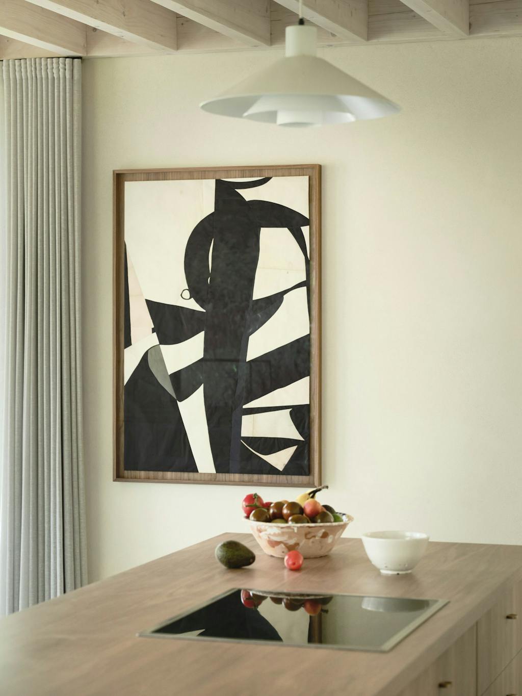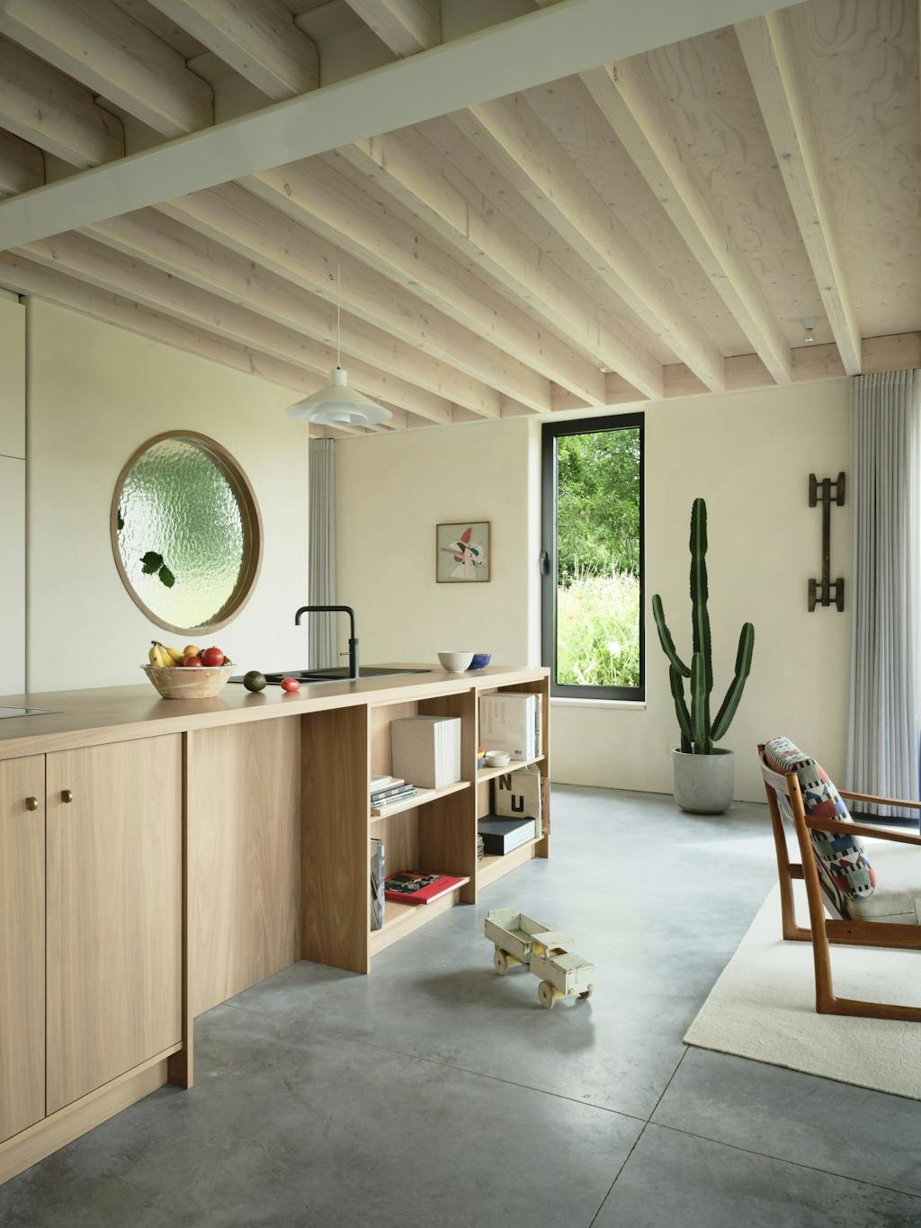 - Die geeft een mooi effect in de zon. De keuken is van walnotenhout en in het ronde raam tussen de keuken en werkkamer en in de slaapkamerdeur zit kathedraalglas. We hebben de basis vrij neutraal gehouden, zodat we de kunstwerken en meubels juist kleur konden geven, vertelt Jesse.