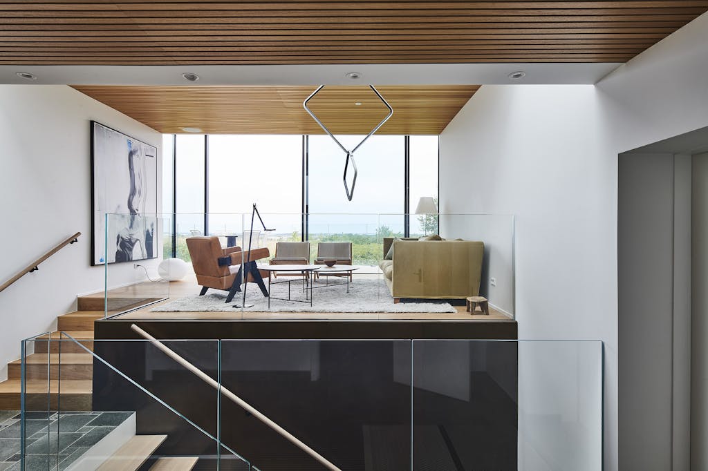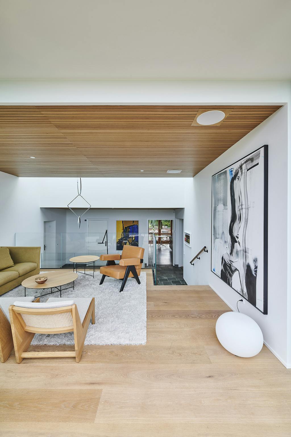 En terwijl de eigenaren aan het renoveren waren, besloten ze twee vliegen in een klap te slaan: als de nieuwe woonkamer iets verhoogd werd, was er beneden ruimte voor een even gewilde wijnkelder, waar voorheen kinder- en logeerkamers waren. Ze maakten ook van de gelegenheid gebruik om de gang en trap naar de benedenverdieping een upgrade te geven. Er is een groot dakraam toegevoegd, waardoor de nieuwe ingang naar de kelder ook daglicht krijgt.