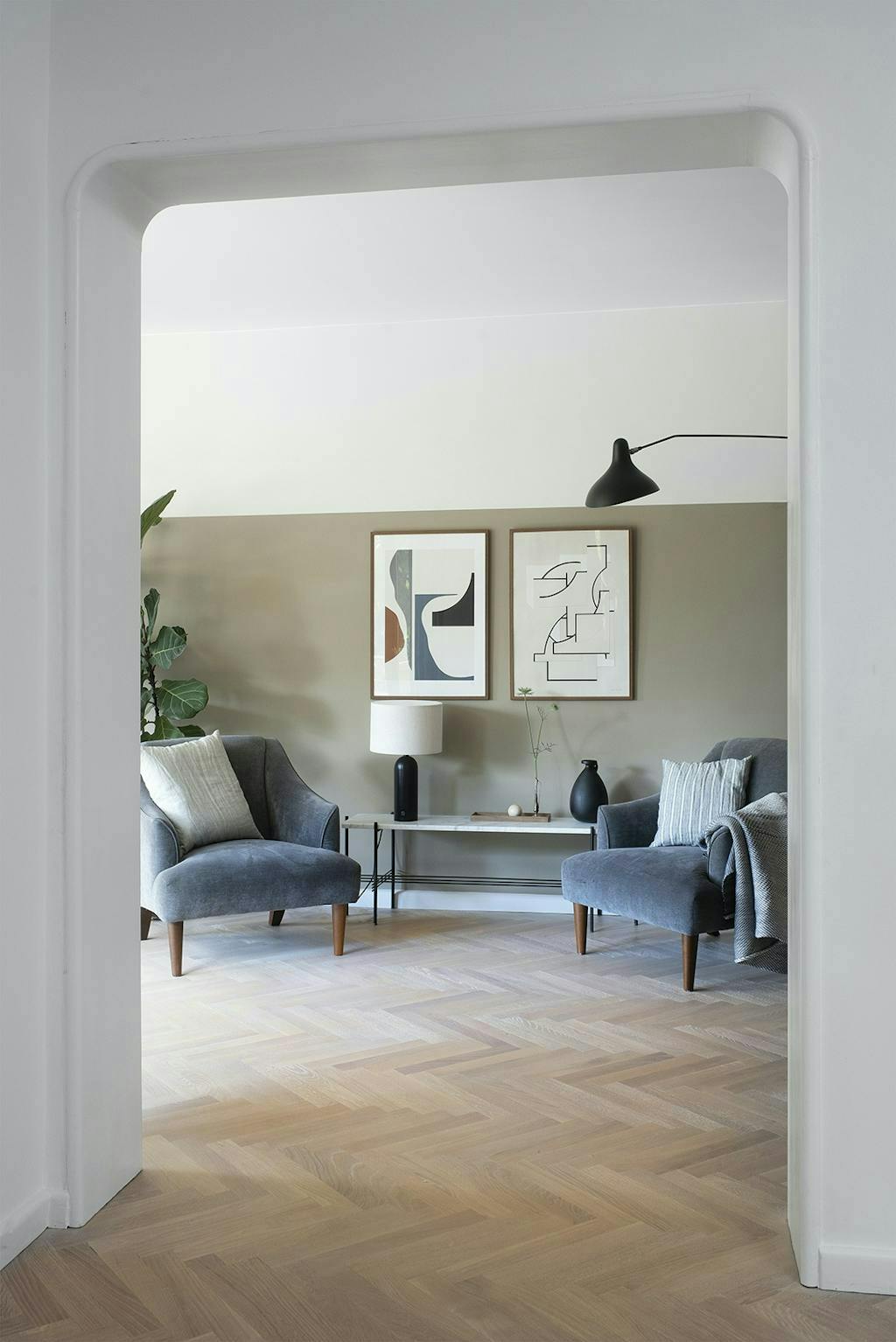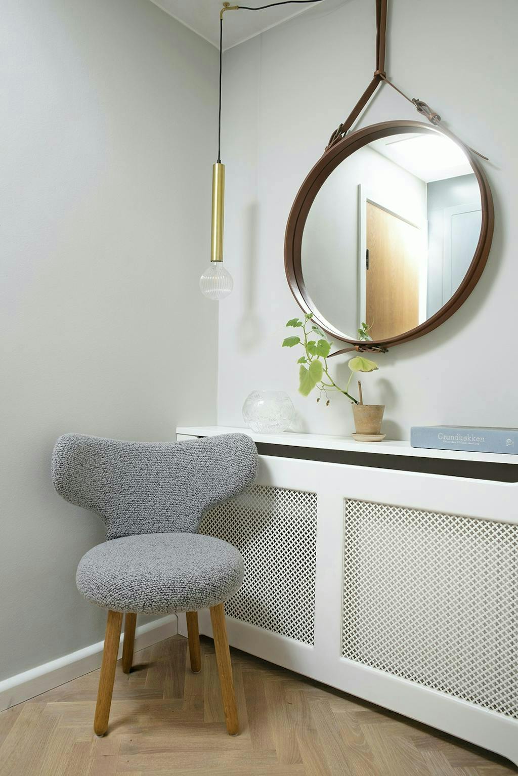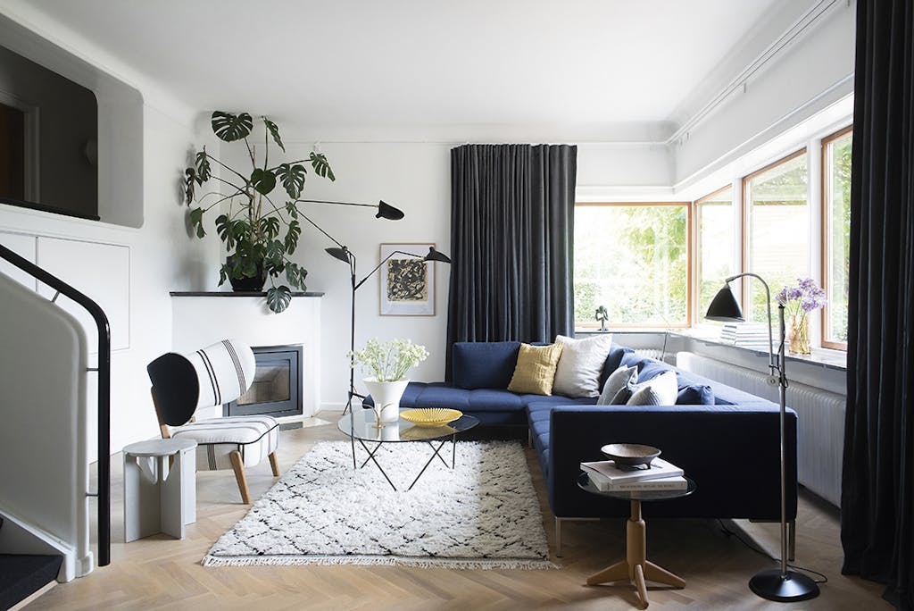 Funky kleuren: op het gebied van kleur heeft Louise nagedacht over wat past bij de bouwstijl van het huis, gebaseerd op het feit dat het modernisme niet alleen over wit, strenge en grafische lijnen ging. Verschillende huizen uit de jaren 1930, zoals het rijtjeshuis van Arne Jacobsen in Bellevue, zaten vol prachtige kleuren. In die geest heeft ze de gevel van het huis, de bakstenen, gebruikt als inspiratiebron voor het kleurenschema in het interieurontwerp, dat een spel van groene, roodachtige, gele, bruine, beige en grijze tinten heeft. Ze worden voorzichtig herhaald op de muren, het textiel en het meubilair. Daarvoor heeft Louise veel kleurstalen doorgenomen om de juiste te vinden, want de oefening was om de kleuren te gebruiken om een warme en comfortabele omgeving te creëren, terwijl ze opgaan in de omgeving en de unieke details van het huis benadrukken.