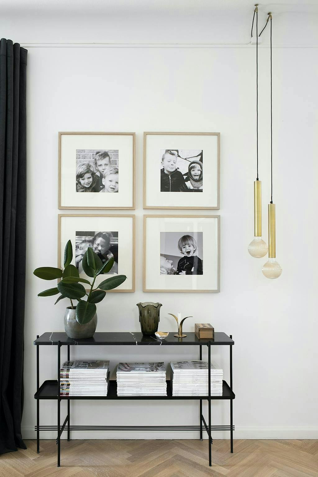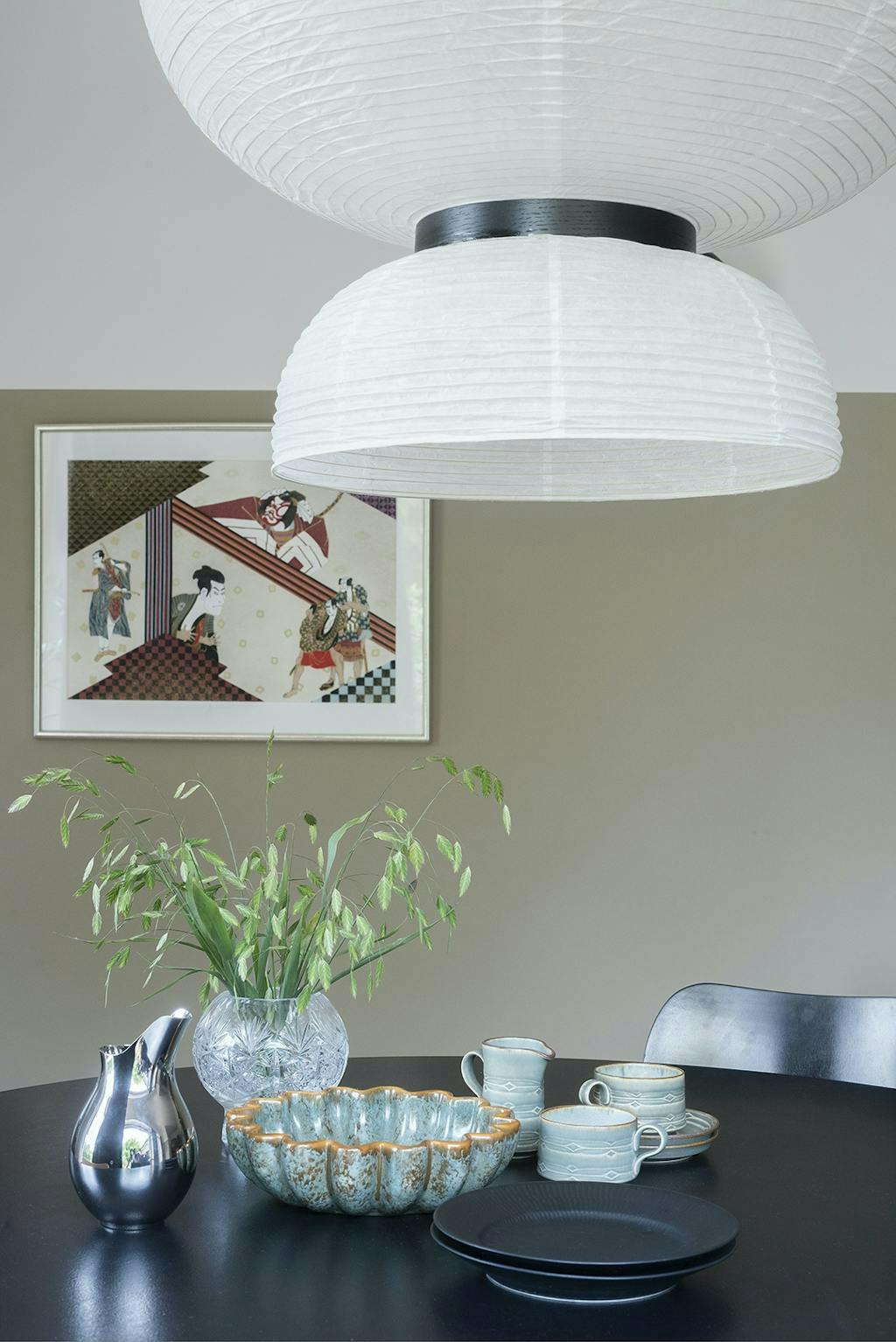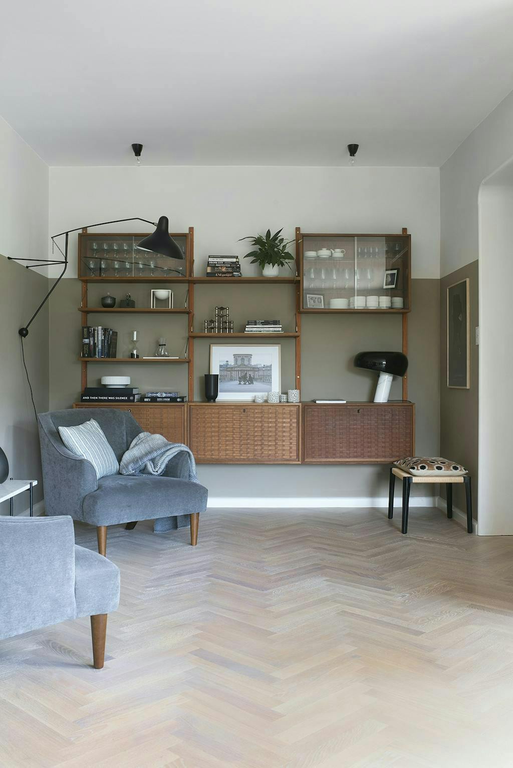 Funky kleuren: op het gebied van kleur heeft Louise nagedacht over wat past bij de bouwstijl van het huis, gebaseerd op het feit dat het modernisme niet alleen over wit, strenge en grafische lijnen ging. Verschillende huizen uit de jaren 1930, zoals het rijtjeshuis van Arne Jacobsen in Bellevue, zaten vol prachtige kleuren. In die geest heeft ze de gevel van het huis, de bakstenen, gebruikt als inspiratiebron voor het kleurenschema in het interieurontwerp, dat een spel van groene, roodachtige, gele, bruine, beige en grijze tinten heeft. Ze worden voorzichtig herhaald op de muren, het textiel en het meubilair. Daarvoor heeft Louise veel kleurstalen doorgenomen om de juiste te vinden, want de oefening was om de kleuren te gebruiken om een warme en comfortabele omgeving te creëren, terwijl ze opgaan in de omgeving en de unieke details van het huis benadrukken.