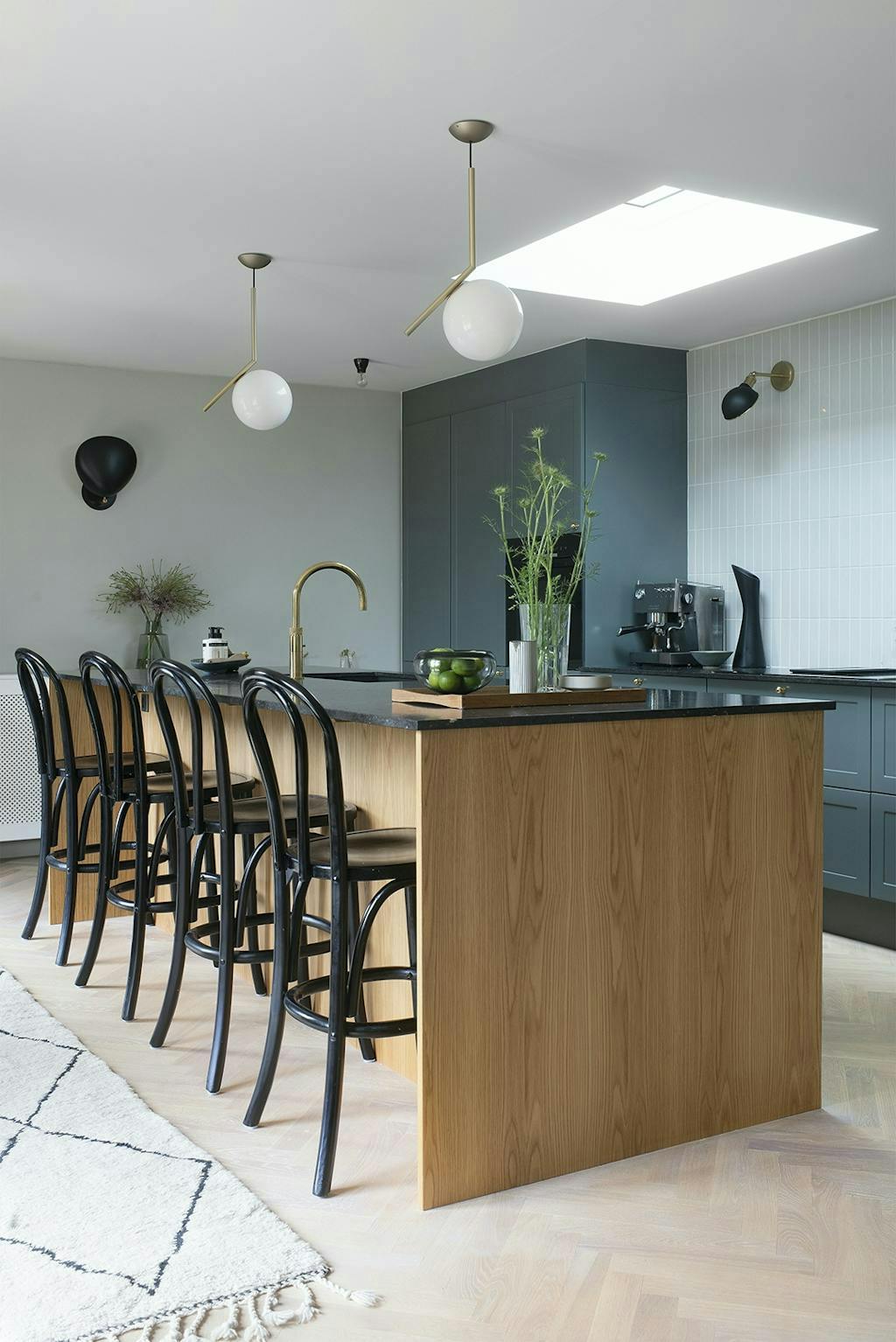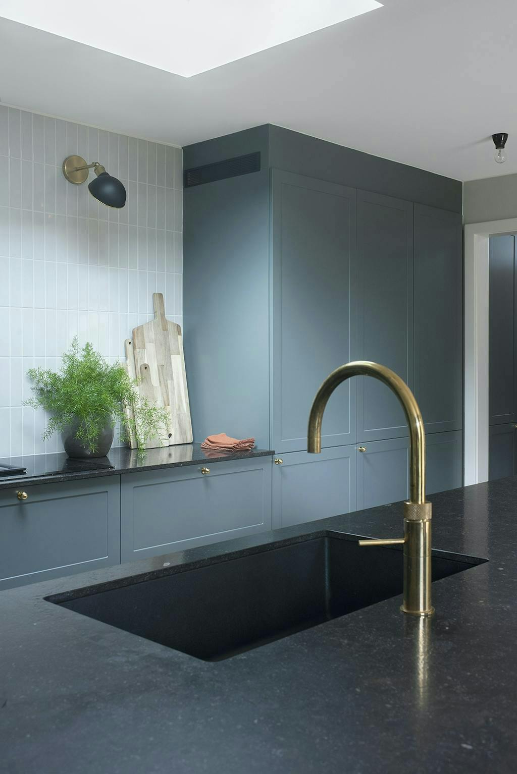 DoorOm meer licht te krijgen is een dakraam ontworpen. De tegels van het Spaanse Equipe Céramicas werden gekozen in een warme grijze tint die past bij de grijze muurkleur, die werd geverfd met Light Antique Grey van Jotun Lady. De kleur van de keukenkastjes van Tvis Køkkener heet Storm Grey en varieert tussen donkergrijs en groenachtig afhankelijk van het licht. Het koppel wilde een werkblad van Belgisch graniet, hetzelfde materiaal als de vensterbanken van het huis, maar dat was onmogelijk te vinden. Het dichtst dat ze bij Belgisch graniet konden vinden was European Black, wat niet het meest praktische was, maar ze wilden niet inleveren op esthetiek.