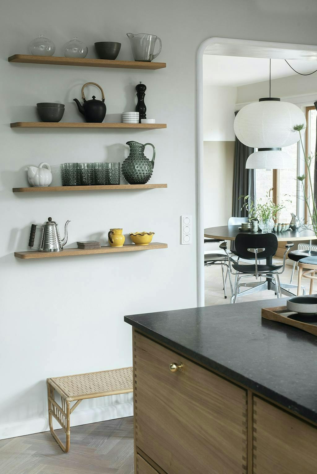 De planken creëren ruimte voor een tentoonstelling van glas en keramiek van merken als Unum en Royal Copenhagen.